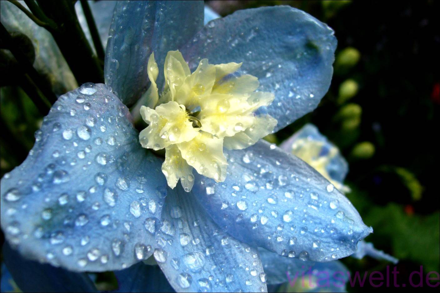 | B35 Nahaufnahme einer mittelblauen Ritterspornblüte. Diese hat 5 rundliche Blätter am äußeren Rand. In der Mitte der Blüte öffnet sich ein weiterer Blütenkranz aus vielen sahne- weißen Blütenblättchen. Alles ist von glitzernden Wasserperlchen benetzt. Erfrischend blau. Mail mit der Karte B35 versenden Karte B35 bestellen Karte B35 vergrößern | |