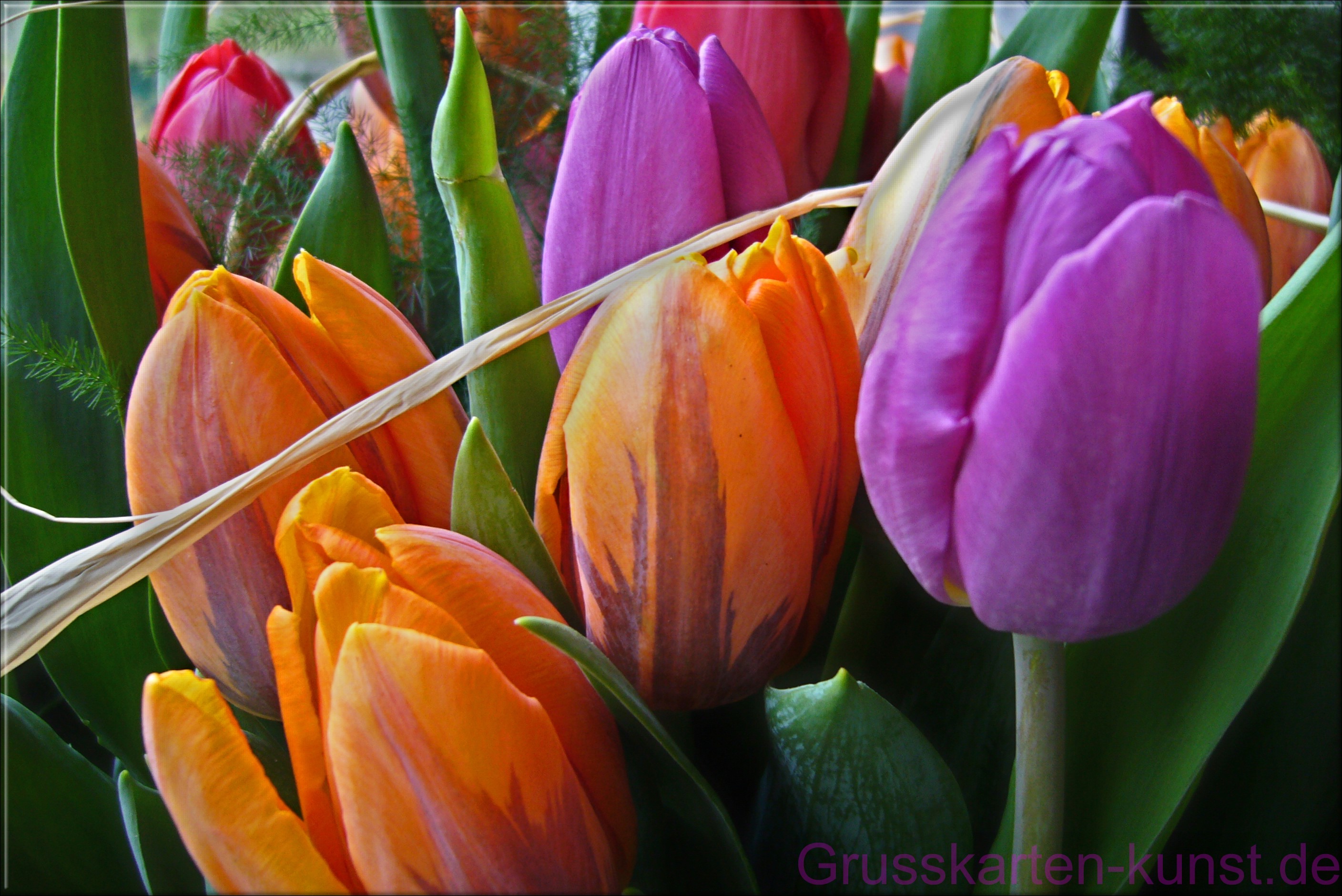 B36 Ausschnitt eines üppigen Tulpenstraußes in den Farben Lila, Orange und Himbeerrot. Die sich zu Öffnen beginnenden Blüten durchziehen das Bild diagonal. Spannende Ordnung, die durch einen Strohalm, der den Strauß auflockernd schmückt, unterstützt wird. | ![]() |