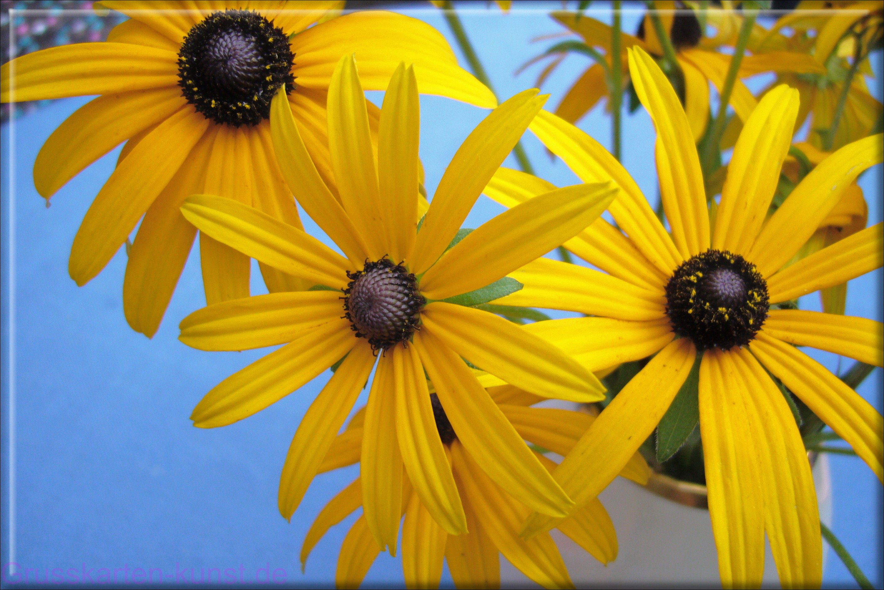 | B37 Diese gelben, sternförmigen Blüten der Sonnenblumenstaude steckten in einer Vase, die auf einer mittelblauen Tischdecke stand. Ein blau- gelber Knaller ohne Schnickschnack. Mail mit der Karte B37 versenden Karte B37 vergrößern | |