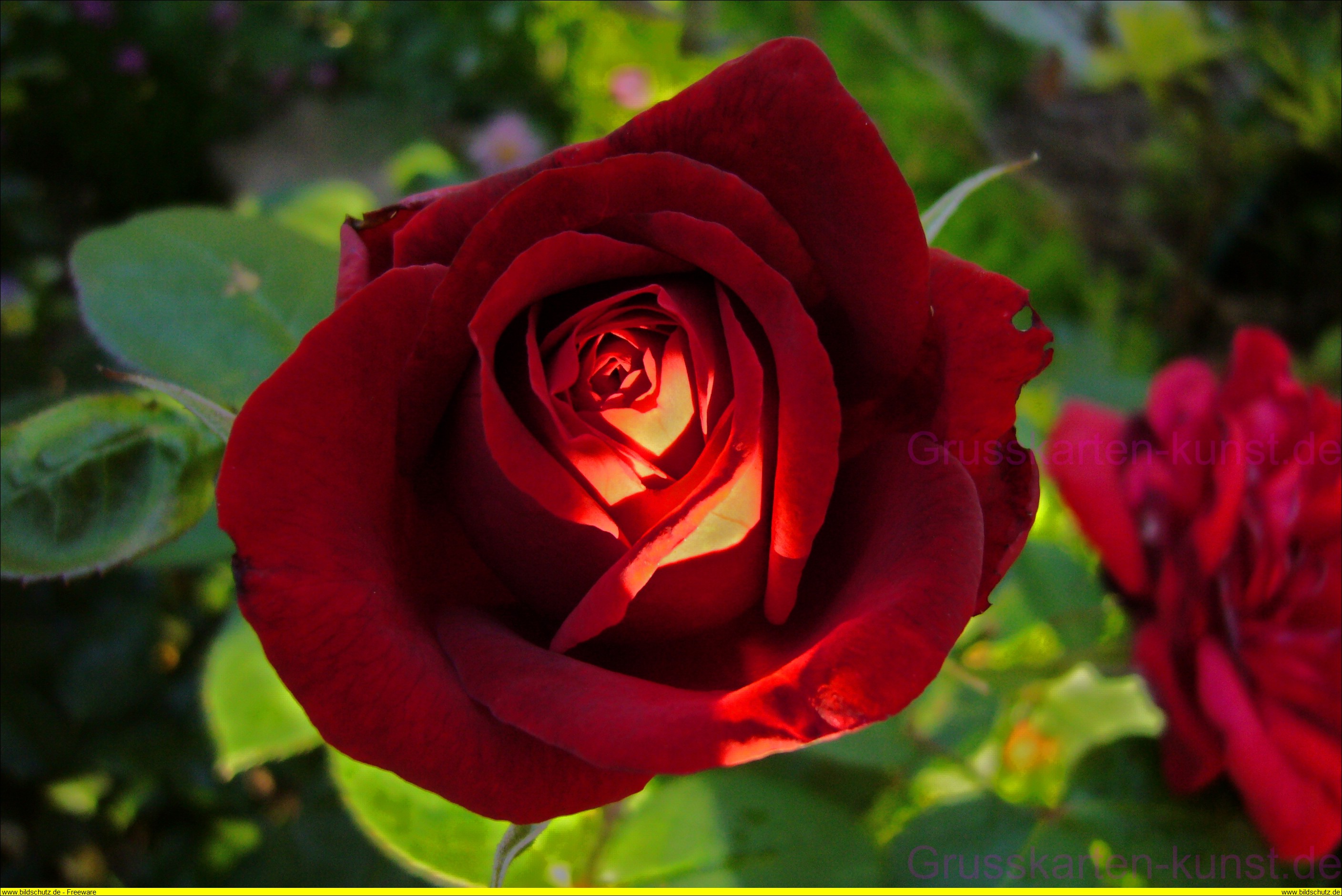 | B38** Hier öffnet sich eine rote Rose im tiefstehenden Licht der Sonne. Die von oben fotografierte Blüte steht im Zentrum der Karte. Im Hintergrund leuchtet das Blattgrün in verschiedenen Grüntönen. Ein Lichtstreif "berührt" die Rose in der Mitte, wo die Blütenblätter noch dicht zusammenstehen. Strahlt Ruhe aus. Mail mit der Karte B38 versenden Karte B38 vergrößern | ![]() |