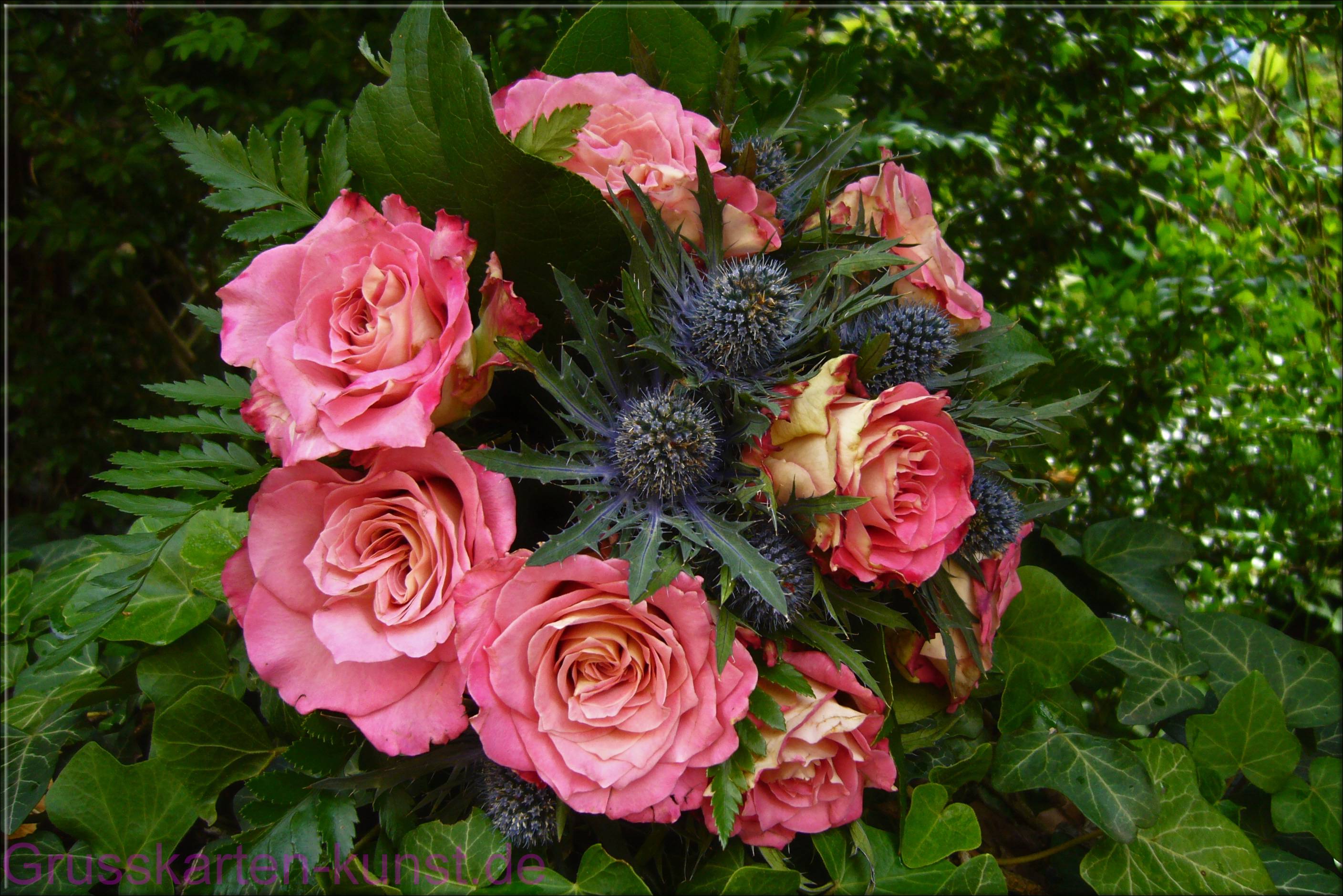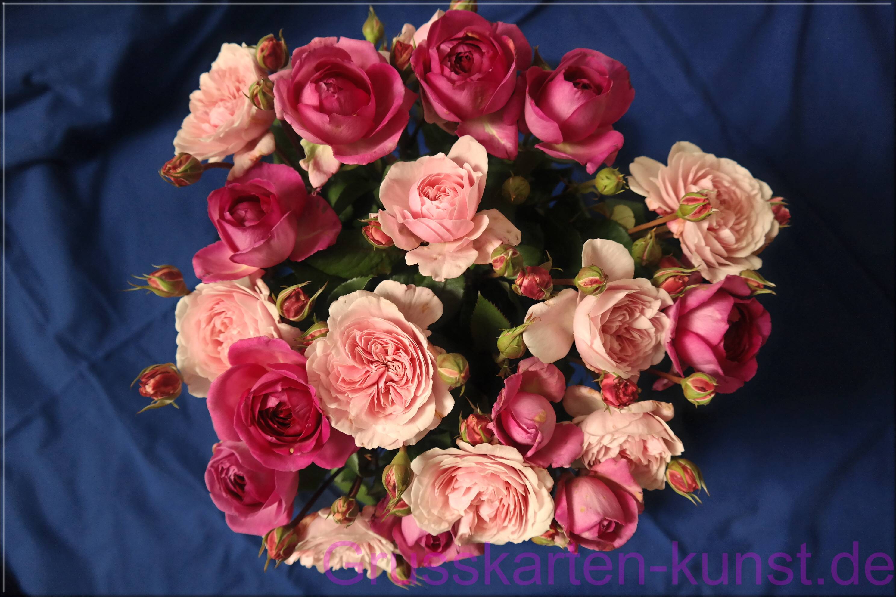 | B59 Ein herrlich "fetter" Rosenstrauß mit duftenden rosa und dunkelrosafarbenen Blüten. Dazwischen noch geschlossene Knospen und ein wenig Blattgrün. Alles von oben in den satten, gefüllten Blütenstrauß Fotografiert, der Hintergrund ist dunkelblau. Man riecht die Fülle förmlich... Mail mit der Karte B59 versenden Karte B59 vergrößern | |