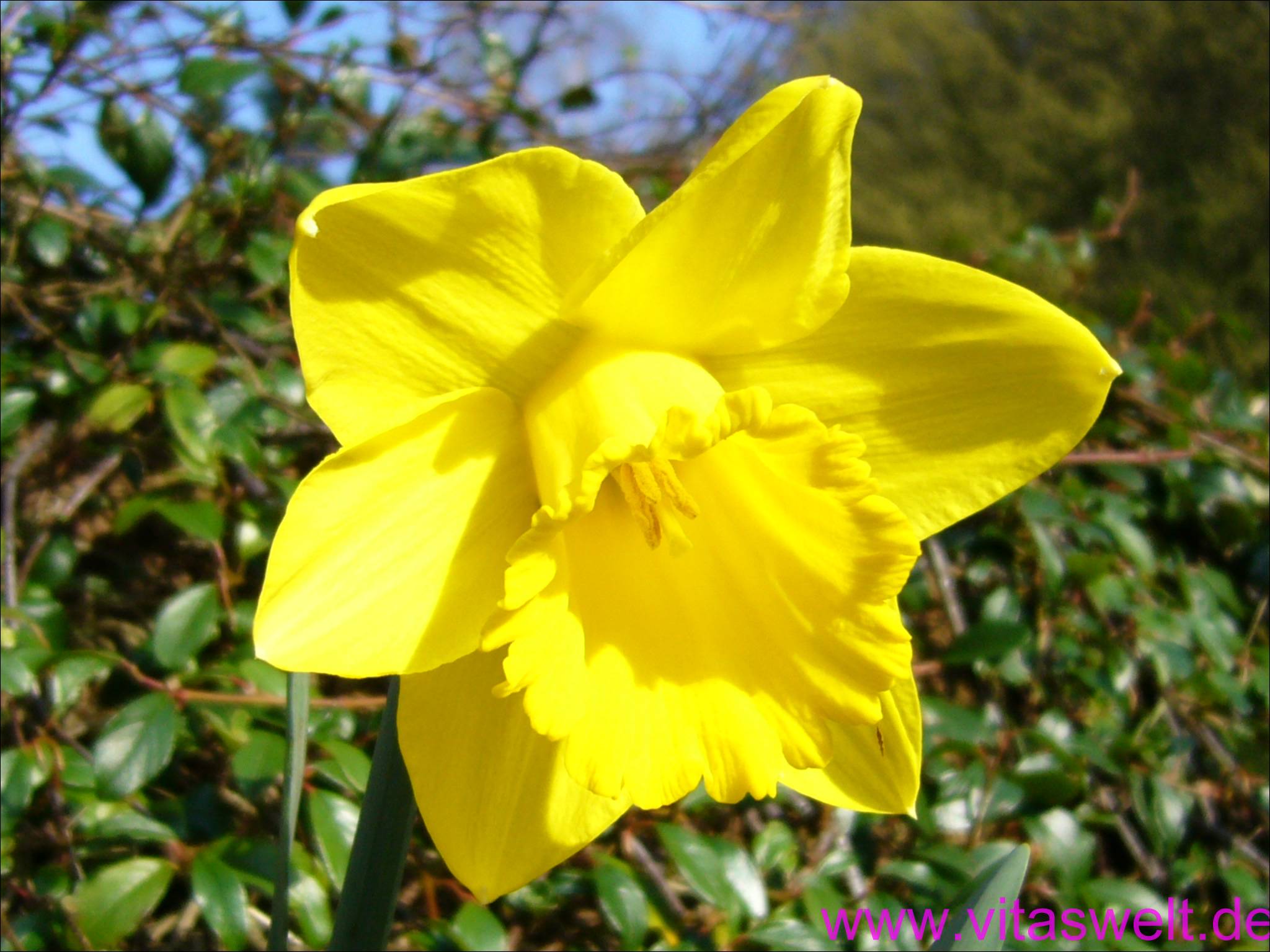 | B04 Großaufnahme einer leuchtendgelben Osterglockenblüte. Hintergrund: oben Himmelblau hinter Zweigen, unten dunkelgrüne Blättchen. Lachendes Frühlingserwachen! Mail mit der Karte B04 versenden Karte B04 bestellen Karte B04 vergrößern | |