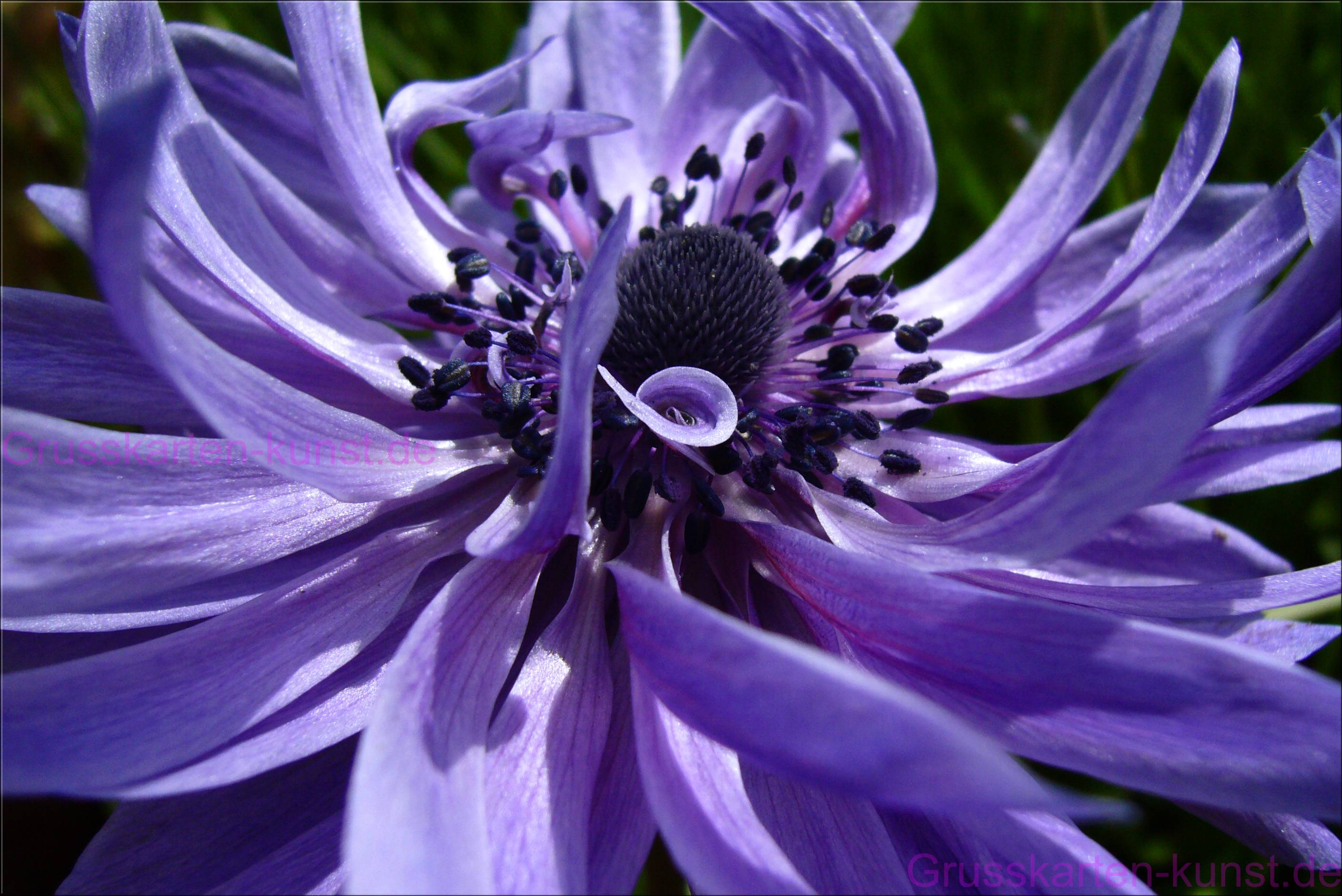 | B40 Bläulich-lila farbene Anemonenblüte mit tiefdunkler Mitte. Um den mittleren Pollenstand strecken sich länglich, schmale Blütenblätter erst nach außen und am Ende dann wieder Richtung Himmel. Teilweise verdrehen sie sich dabei, sodass ein schnörkeliger Blütenkopf entsteht. Diese zarten Gewächse entstehen aus Zwiebelknöllchen. Phantastische Natur. Mail mit der Karte B40 versenden Karte B40 vergrößern | |