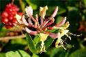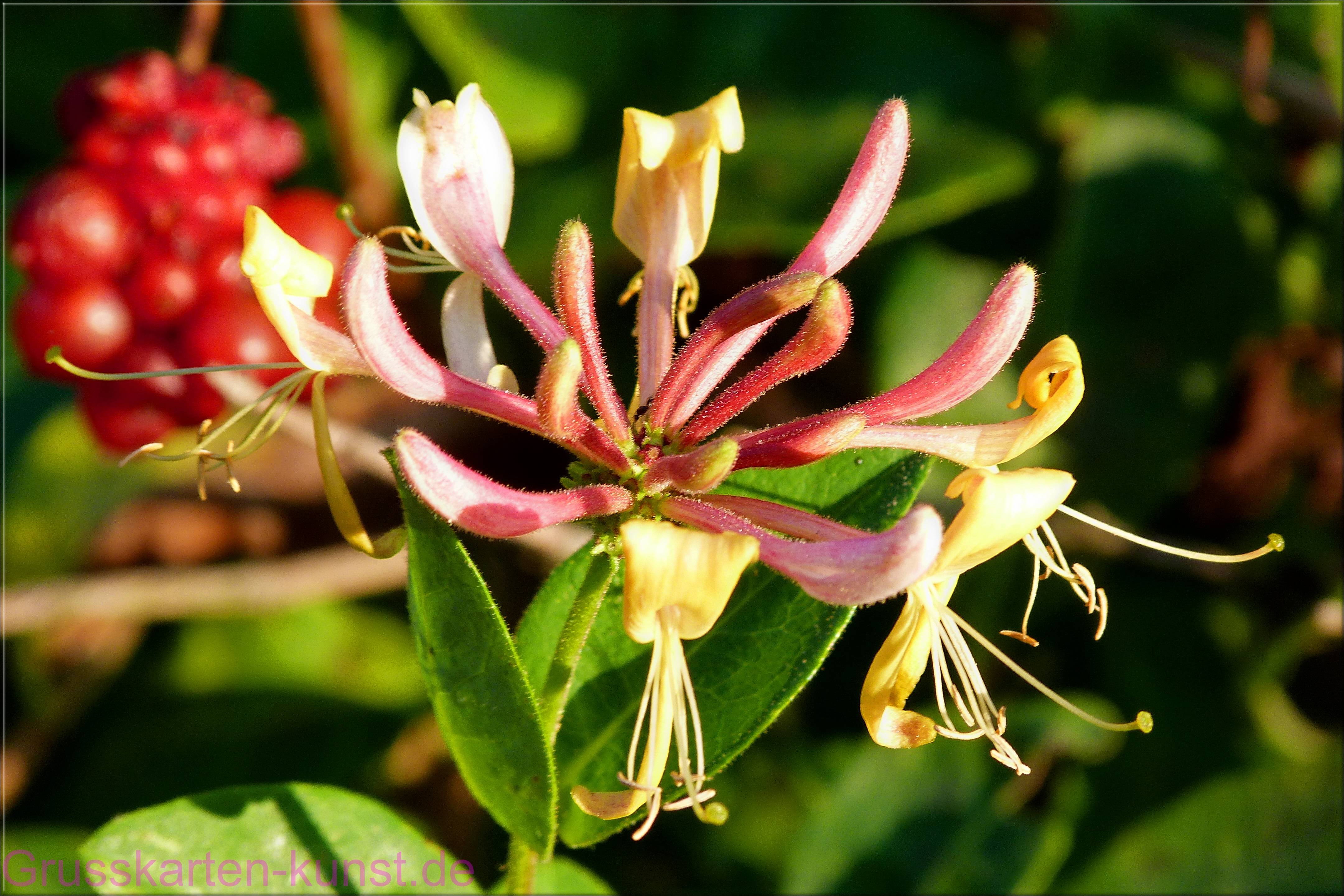 | B42 Goldgelbe Geißblattblüte im Oktober. Im Hintergrund leuchten die roten Früchte der gleichen Pflanze in Traubenform und von der Sonne angestrahlte Blätter in verschiedenen Grüntönen. Wie kleine Minibananen recken sich die gebogenen und noch geschlossenen Blüten kreisrund gegen den Himmel. Diese sind zart rosafarben, während die schon geöffneten , trompetenförmigen Blüten gelb leuchten. Zierliche, edle Nahaufnahme. Mail mit der Karte B42 versenden Karte B42 vergrößern | |