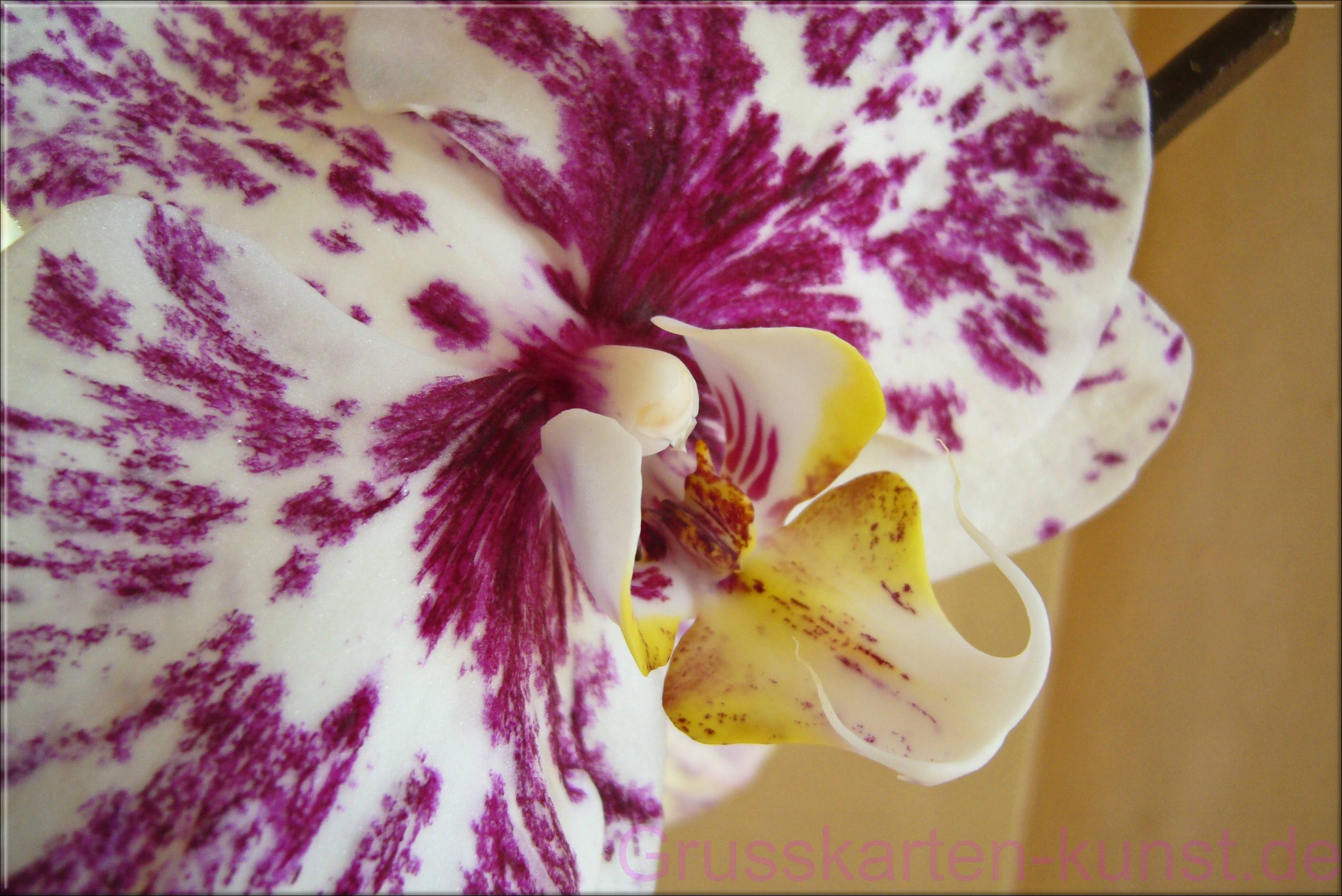 | B43 Diese weiße Orchideenblüte mit dunkel lilafarbenen Sprenkeln und einer gelben Mitte ist eine Seltenheit. Das Lila scheint, wie bei einem nass in nass Aquarell, auf dem Weiß der Blütenblätter zu verteilen. Durch die schräg von oben geführte Aufnahmerichtung entsteht eine zusätzliche Spannung im Bild. Phalaenopsisart. Wie schön, dass sie auch im Winter blühen! Mail mit der Karte B43 versenden Karte B43 vergrößern | |