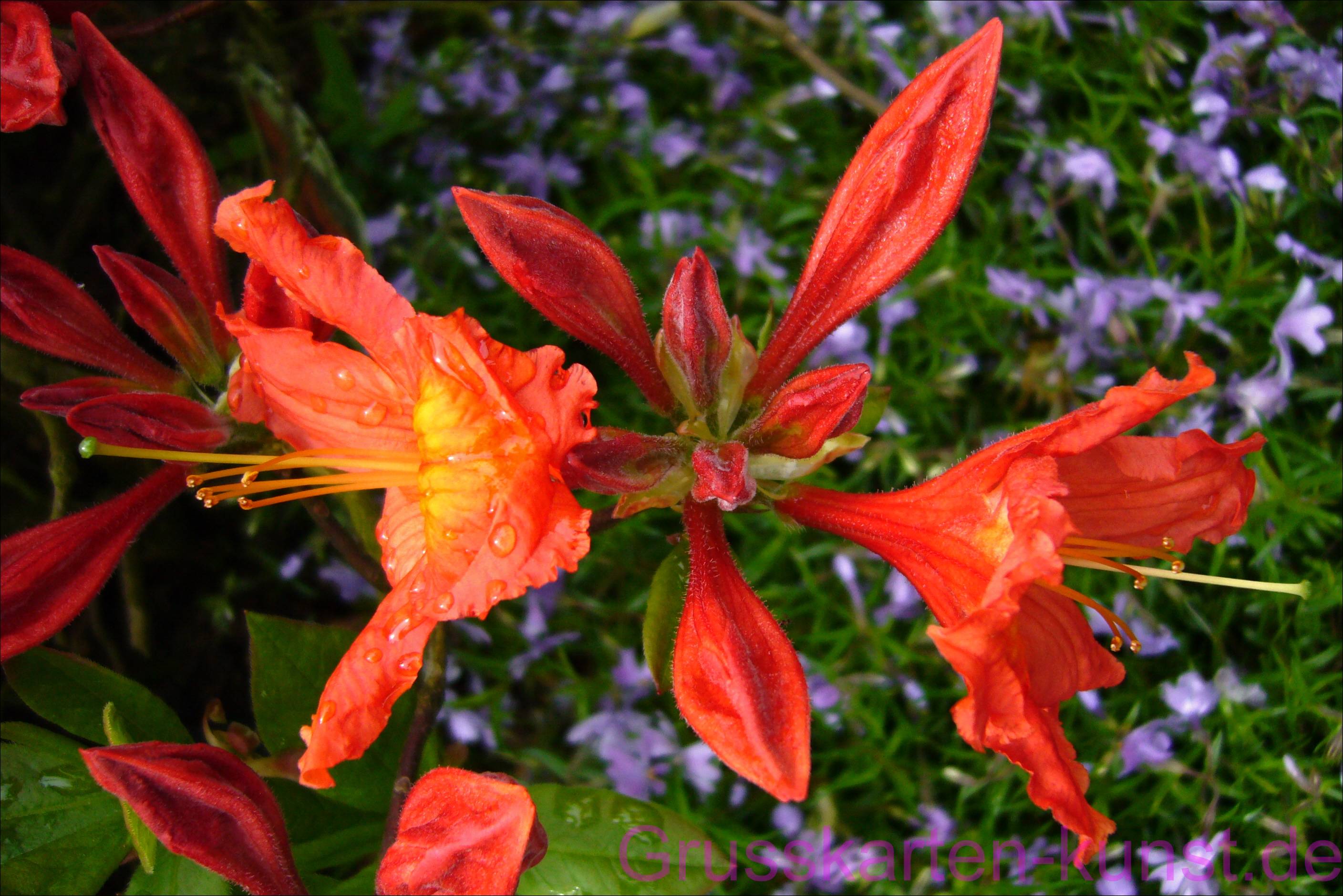 | B44 Leuchtend rostrot-orangene Azaleenblüte inmitten saftigem Grün. Azaleen haben am Ende ihres neuen Triebes mehrere Sternförmig auseinanderstrebende Blütenansätze. Gehen diese nach und nach auf, entsteht eine satte große Dolde. Die hier fotografierte Dolde hat bereits zwei offene Blüten, die nach links und rechts streben. Dazwischen sieht man mehrere, gleichfarbige, noch geschlossene längliche Blüten, die in alle Richtungen zeigen. Bei den bereits trichterförmig geöffneten Blüten schauen die Staubfäden und Blütenstempel waagrecht heraus. Im Hintergrund blühen einige zierlich- violette Blüten. Eine Farbbombe ! Sicht von oben Mail mit der Karte B44 versenden Karte B44 vergrößern | |