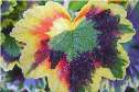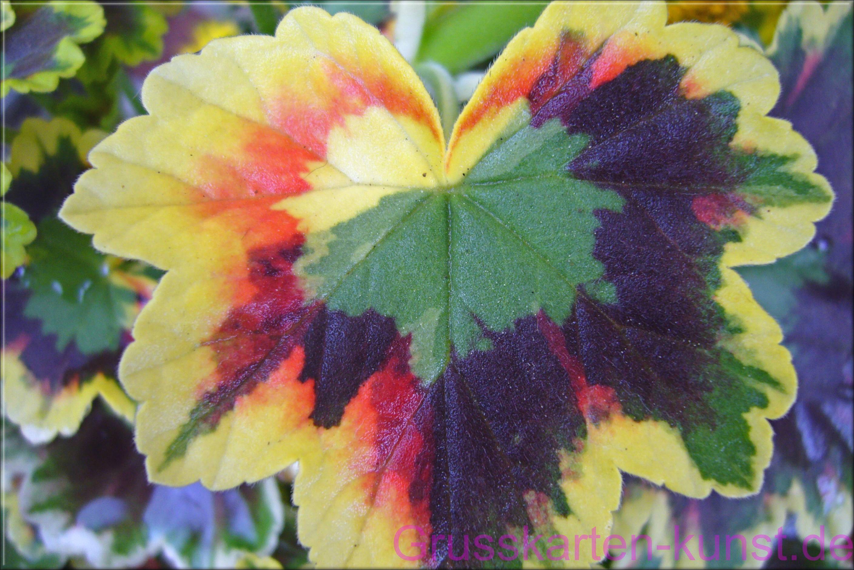 | B45 Ein wunderschönes Geranienblatt am Rand leicht gezackt und wellig erinnert an Aquarellmalerei. Dieses Blatt hat ineinander verlaufende Farben, die der Außenform des Blattes folgen. Außen buttergelb, dann glutorange, rotlila, dunkelgrün und innen hellgrün. Eine Freude! Mail mit der Karte B45 versenden Karte B45 vergrößern | |