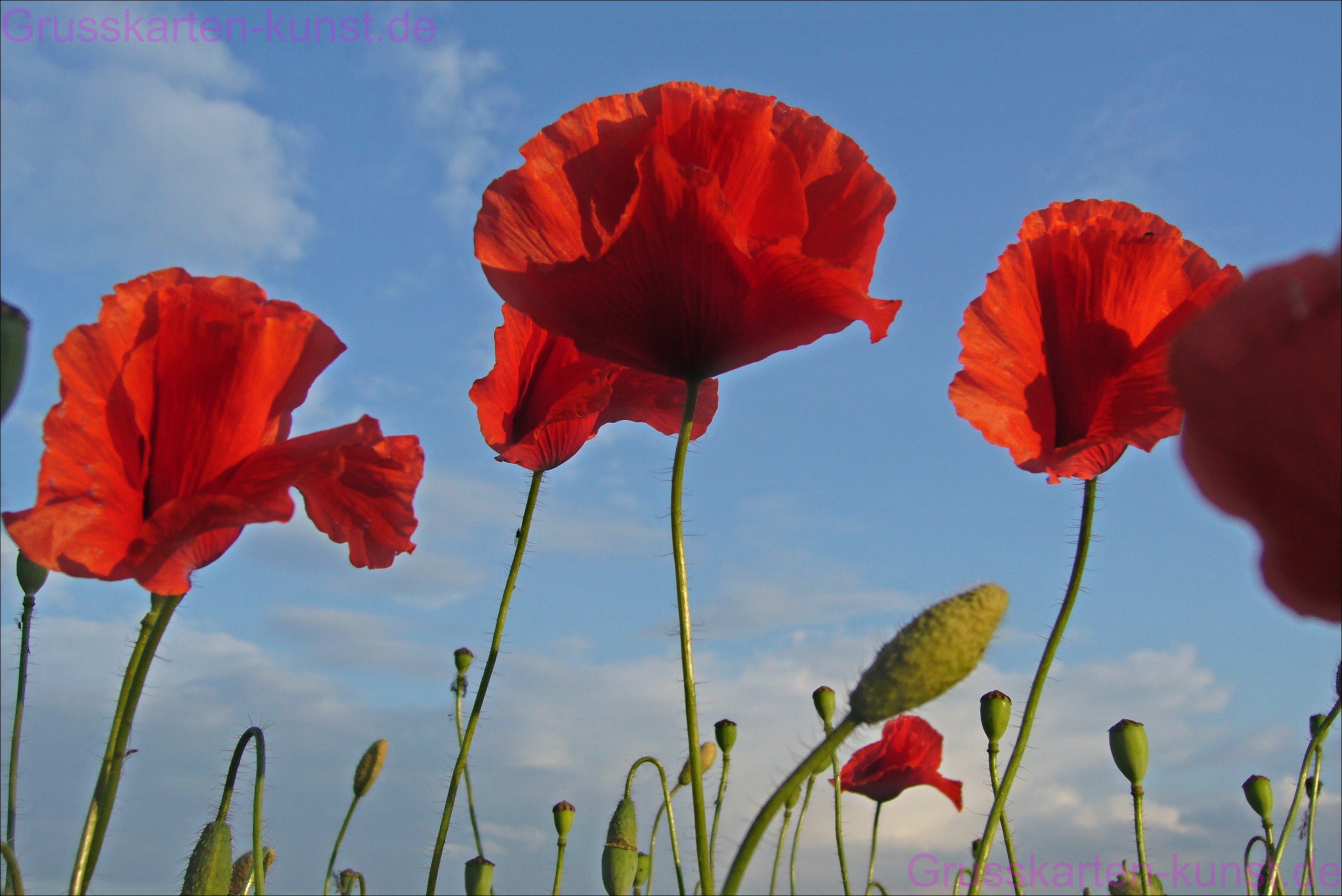 | B46 Roter Klatschmohn wiegt sich im Wind auf hauchdünnen Stielen vor blauem Himmel aus der Froschperspektive. Einfach schöööön. Mail mit der Karte B46 versenden Karte B46 vergrößern | |