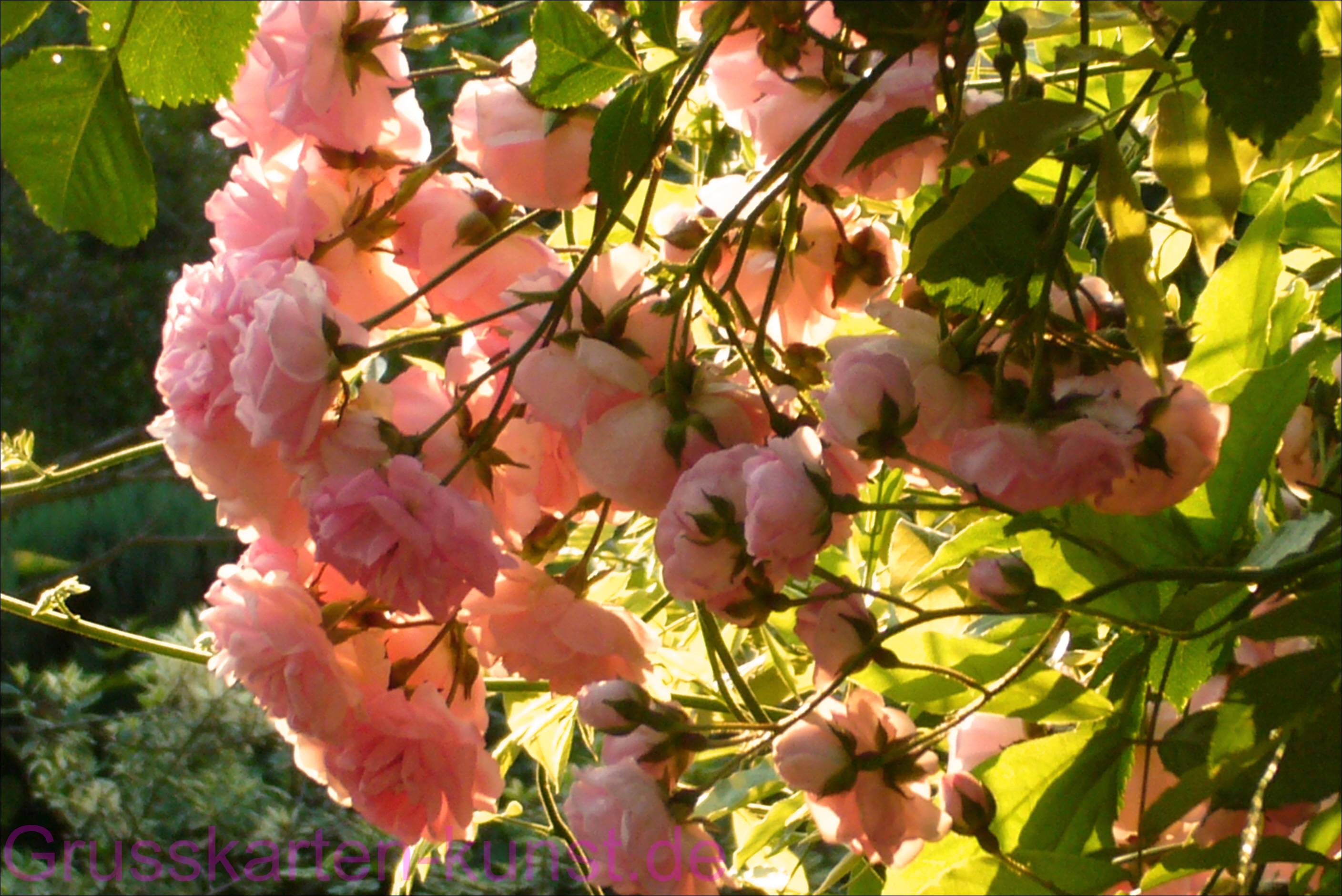 | B47 Eine rosafarbene Rosendolde wird von schräg hinten durch eine tief stehende Sonne beleuchtet. So entstehen warme Farben in sämtlichen Rosa- und Grüntönen, denn das Laub frischt die ganze Szenerie auf. Ein bisschen wie im Märchen. Die Rose namens Super fairy gar etwa kastaniengroße Blüten, die zu Hauf (ca. 20 -30 Stück) am Ende eines Triebes wachsen. Sie schwingen durch ihr Gewicht in einem Kreisbogen herab, sodass sie am Rosenbogen einen Blütenschirm bilden. Der zarte Duft ist leider nur in der Fantasie vorhanden. Mail mit der Karte B47 versenden Karte B47 vergrößern | |