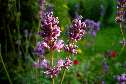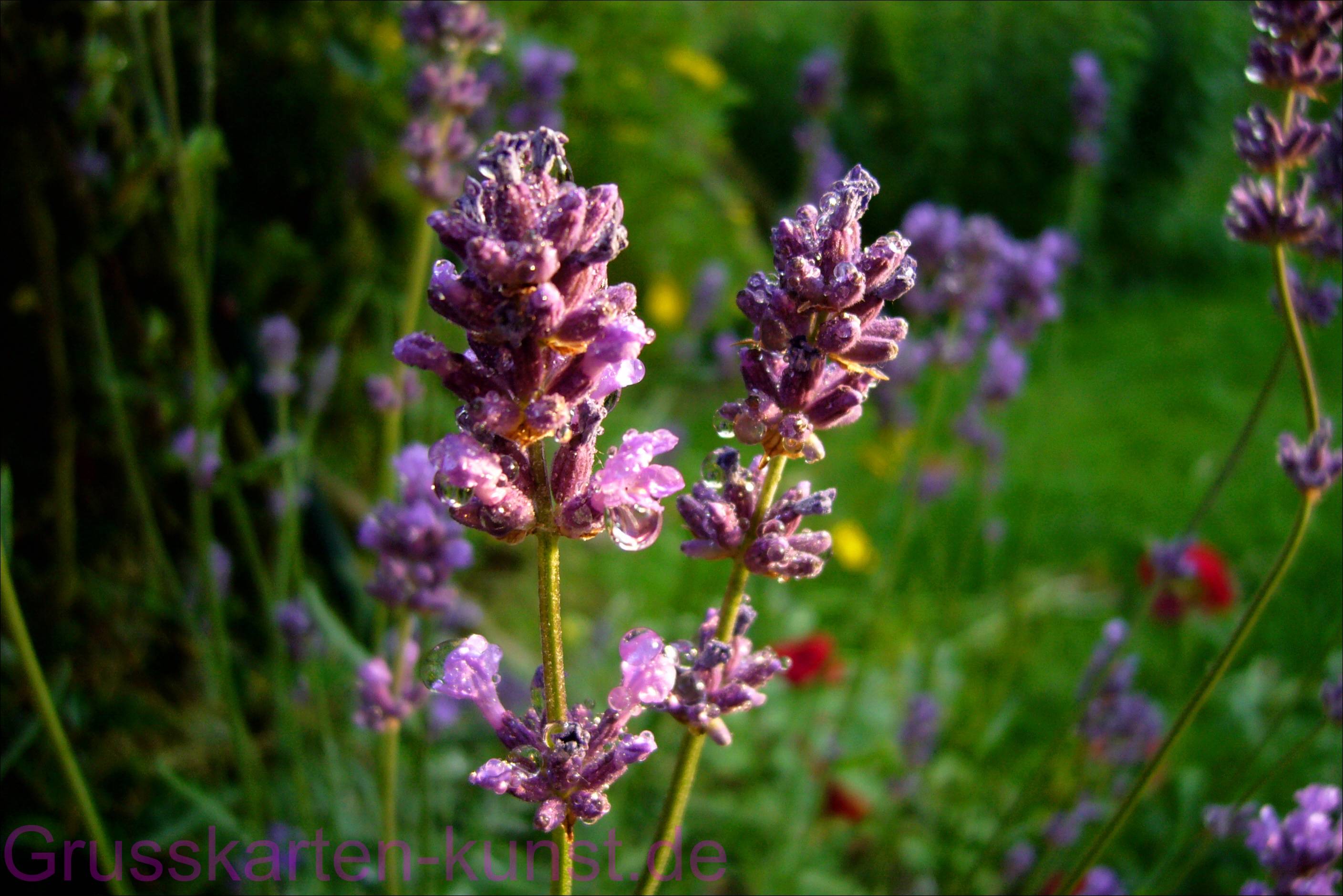 | B48 Zwei Lavendelrispen heben sich, in warmem Sonnenlicht stehend, von einem grünen Hintergrund ab. An einigen Blüten glitzern kleine Wassertröpfchen und rote Rosenblüten zeichnen sich unscharf im Hintergrund als Flecken im Grün ab. Mail mit der Karte B48 versenden Karte B48 vergrößern | |