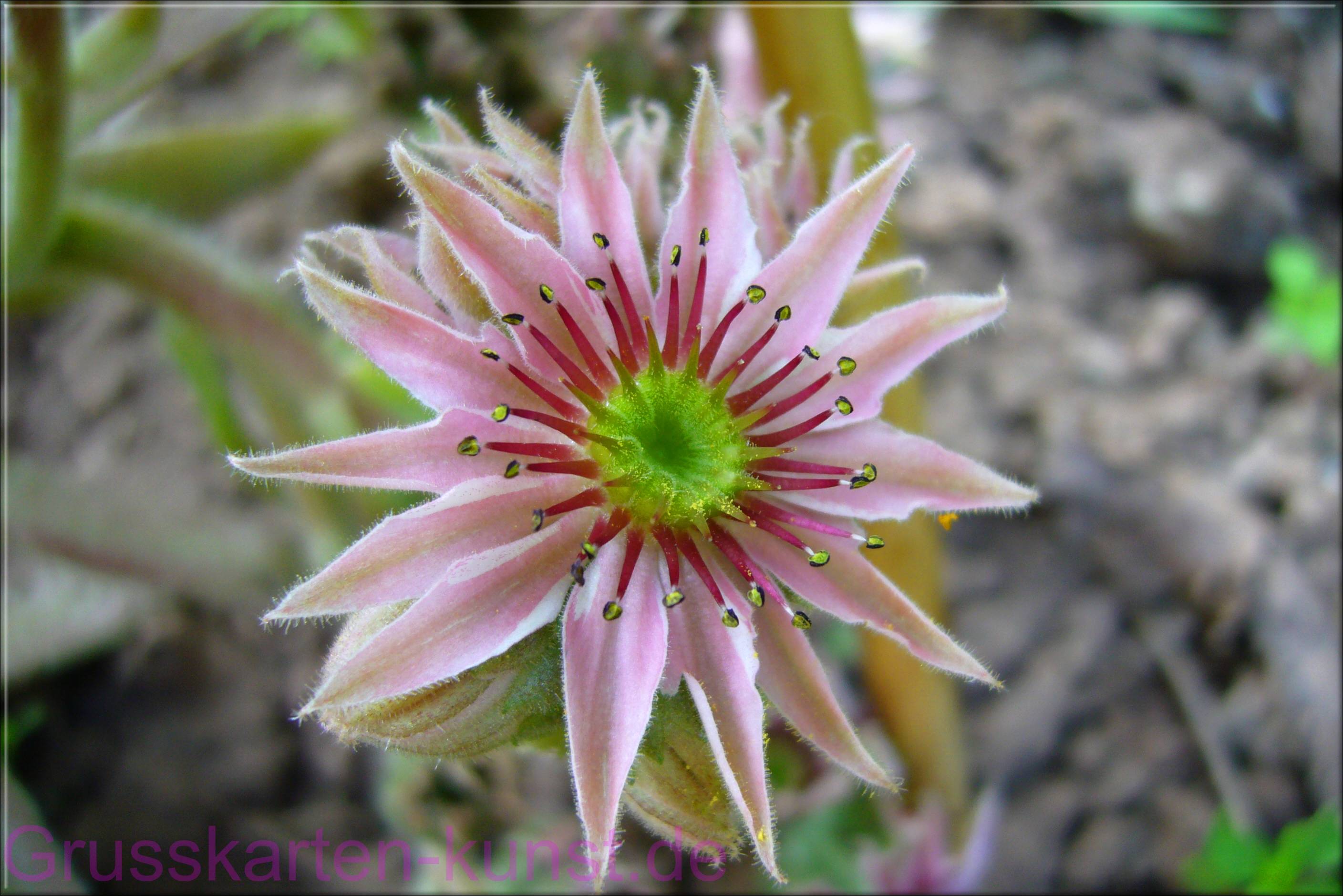 | B49 Ein Überlebenskünstler: Das Sempervivum, auch Hauswurz genannt, kommt ohne viel Wasser aus und bildet trotzdem dickblättrige Blüten und Blütenstände mit dieser zierlich- hübschen Ausformung. Unzählige violett-weißliche, schmale, kelchartige, Blütenblättchen gruppieren sich rosettenförmig um eine saftig grüne Mitte, die auf einem sog. Langtrieb wächst.Von der grünen Mitte ausgehend ragen ca. 28 purpurfarbene dünne Staubfäden empor, an deren Ende grün- gelbliche Pollen hängen. Dezent unscharfer Hintergrund. Ästhetisch. Mail mit der Karte B49 versenden Karte B49 vergrößern | |