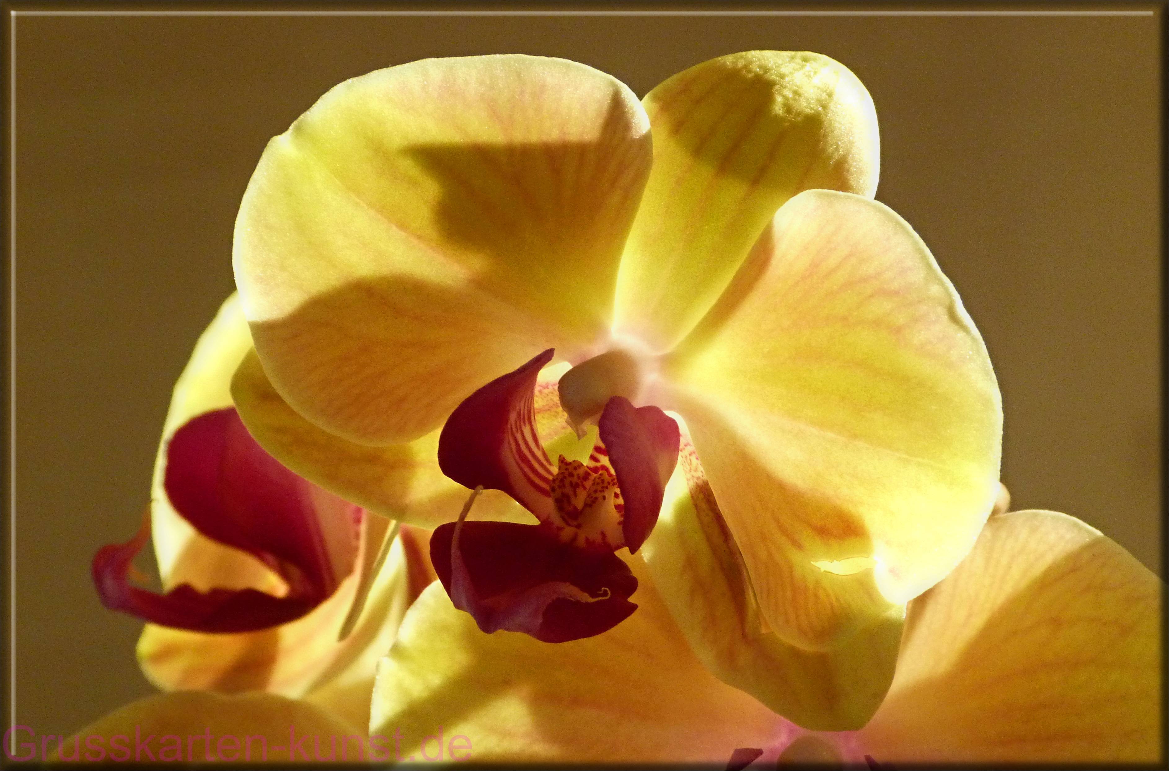 | B50 Diese seltene Orchideenblüte in goldgelb mit violetter Mitte ist eine Seltenheit. Hier wird eine der phantastischen Blüten von hinten von der Sonne beschienen. So entsteht ein lichter, goldener Effekt. Passend zu einem goldenen Oktober? Hintergrund dezent breige. Mail mit der Karte B50 versenden Karte B50 vergrößern | |