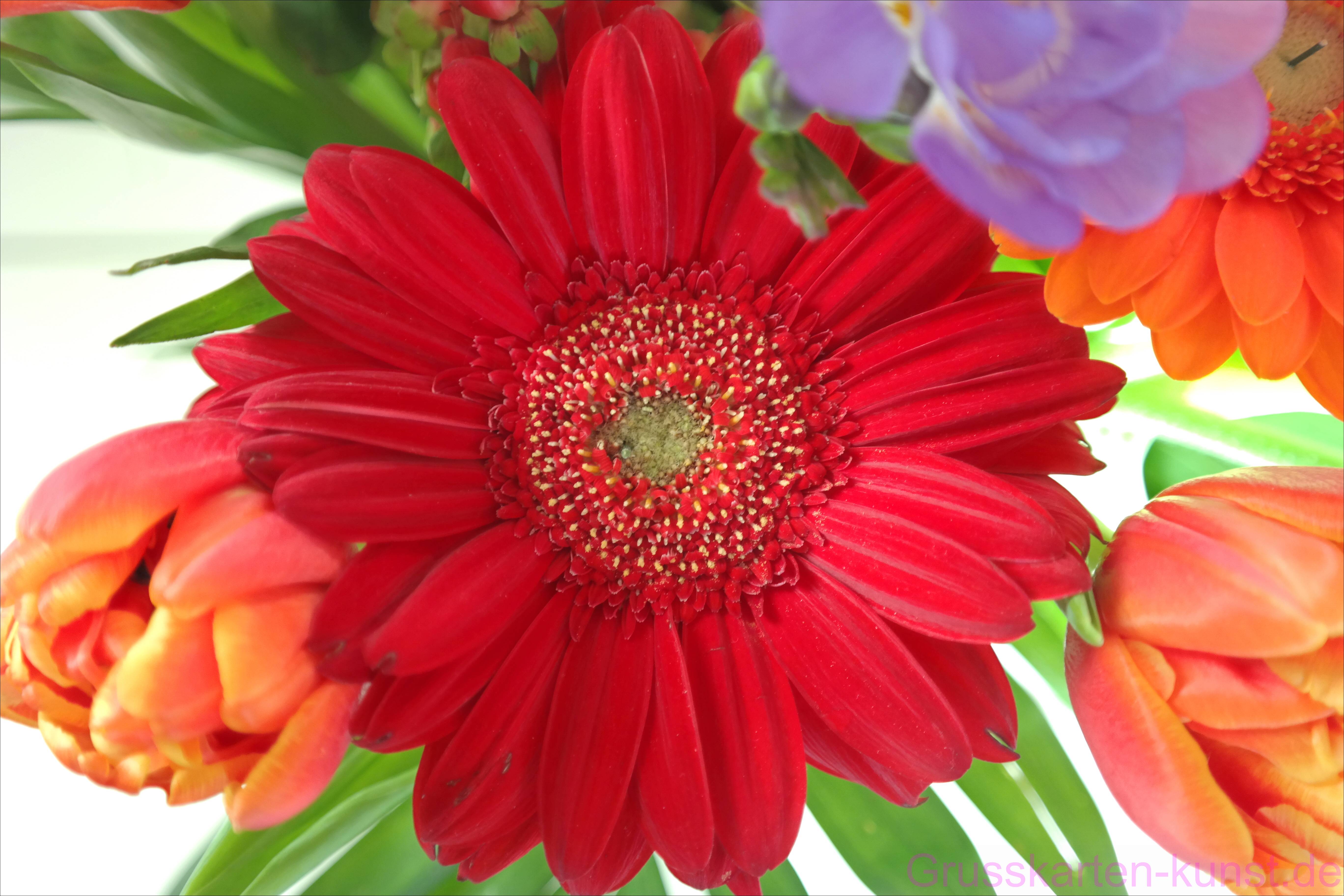 | B51 Ein Knaller ! Im Zentrum eine knallrote Gerbera mit ihren über 70 schmalen strahlenförmig nach außen stehenden Blütenblättern und dem gelb - roten Pollenstand in der Mitte. Darum drapieren sich schmale grüne Blätter zwei orangegelbe geschlossene Tulpen und eine lilafarbene Fresie bei einem weißen Hintergrund. Das peppt auf wie ein buntes Osterei oder die schrillen 70er Mail mit der Karte B51 versenden Karte B51 vergrößern | |