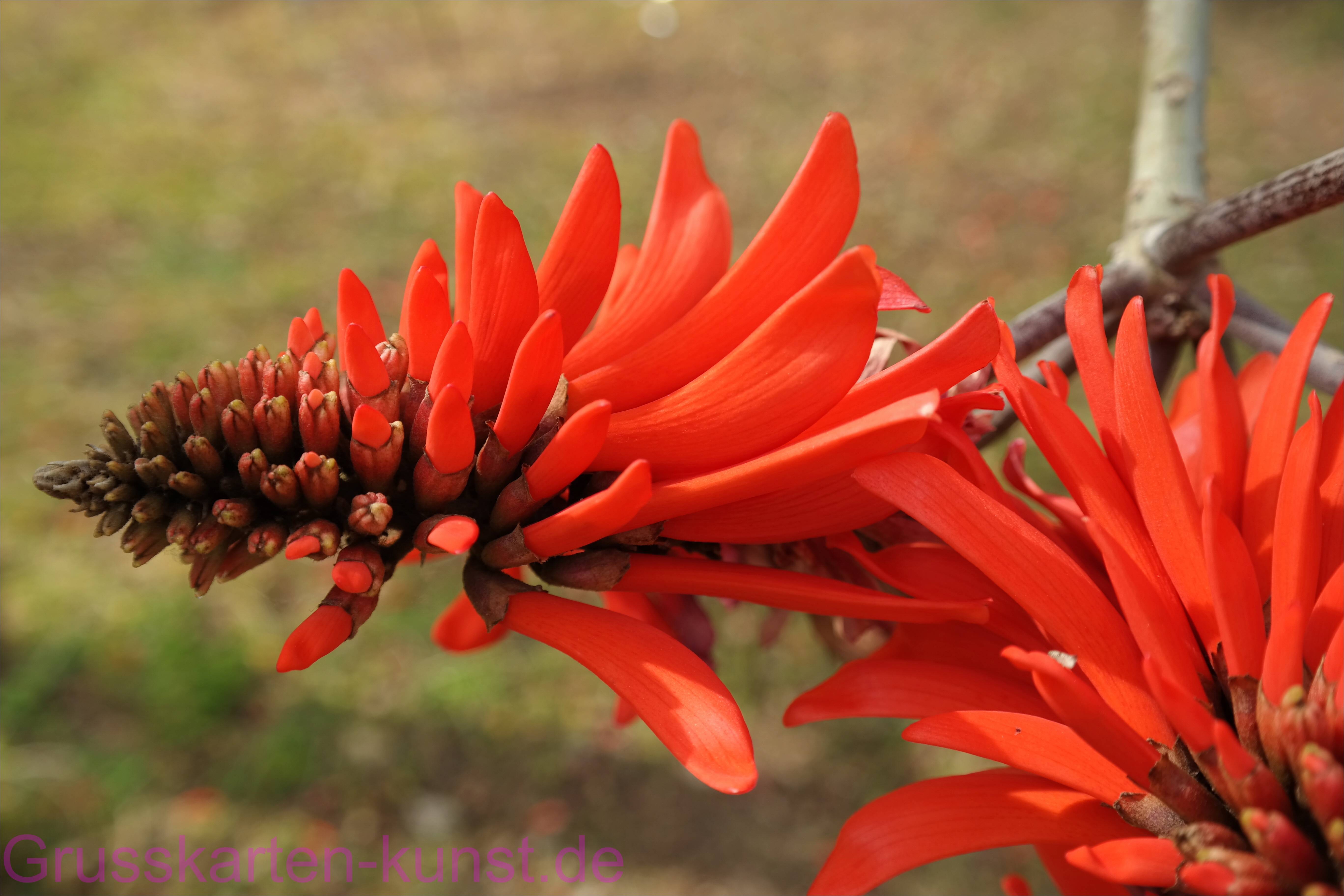 | B52 Der 3 – 5 m hoch wachsende südamerikanische Korallenbaum hat weithin leuchtende ca. 10 cm lange orangerote Blütenstände. Diese im geschlossenen Zustand fast wie ein Tannen-zapfen aussehenden Dolden, tragen ringsherum 5 cm große „gefaltete“sichel- oder segel-förmige Blütenblätter in deren Mitte sich die Fruchtstände zeigen, sobald sich das gefaltete Segel öffnet. Die Blütenblätter öffnen sich nach und nach von hinten zur Doldenspitze. Dieses Foto zeigt eine bis etwa zu Hälfte schon geöffnete Dolde mit ihren nach oben und außen stehenden, korallenroten „Segelchen“ vor einem blassgrünen, unscharfen Hintergrund. Der Baum wird gerne von Papageien besucht, die sich mit ihren bunten Schnäbeln und Kämmen prächtig verstecken können. (Costa Rei, Sardinien) Mail mit der Karte B52 versenden Karte B52 vergrößern | |