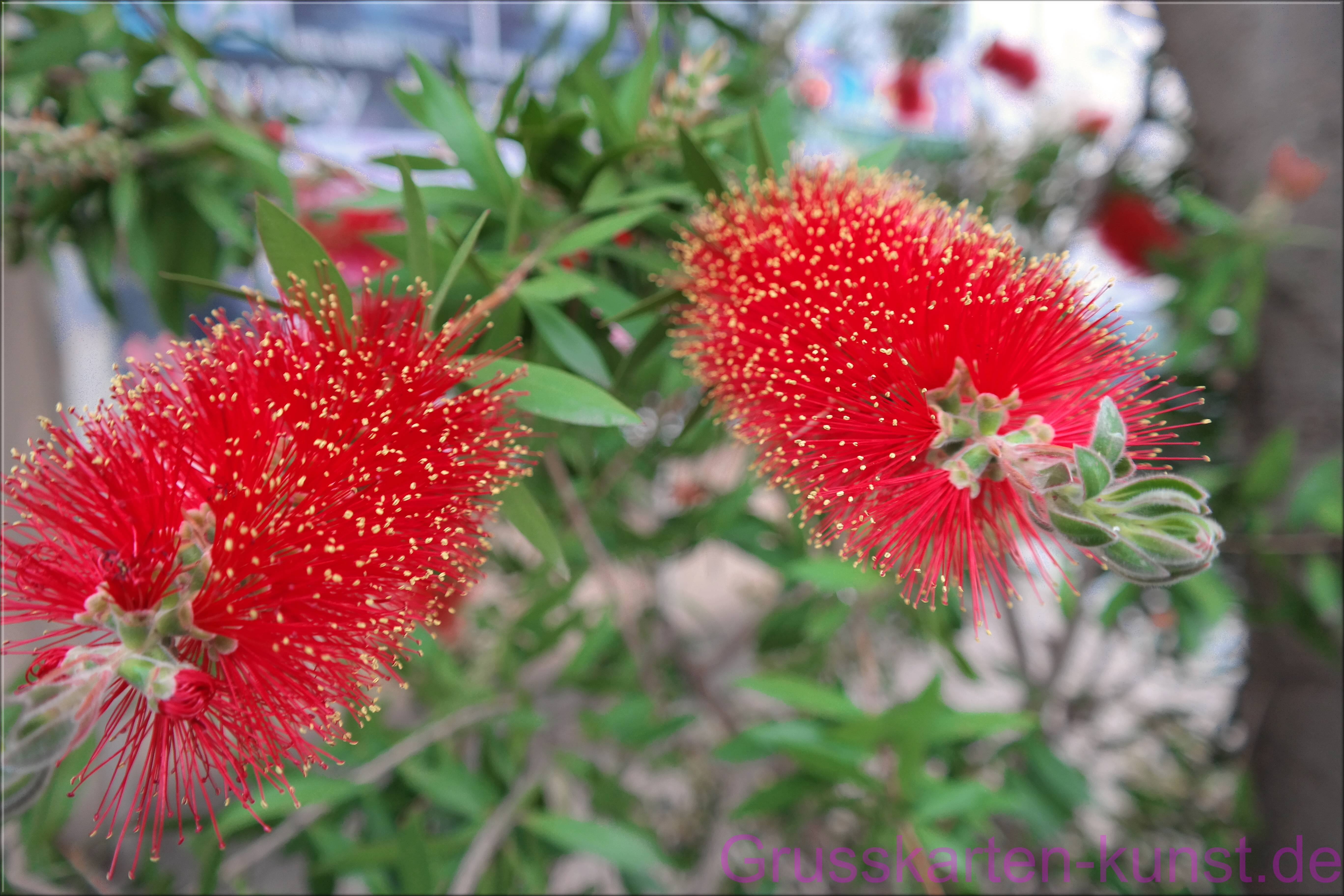 | B53 Wie zwei nach vorne ausgestreckte Finger zeigen zwei karminrote Pfeifenputzerblüten in Richtung des Betrachters. Die Blüten sind etwa 20 cm lang und haben eine zylinderartige Form mit ca. 4-5 com Durchmesser. Um den grünen Stengel herum drapieren sich tausende haarige rote, nadeldicke "Haare", an deren Ende die gelben Blütenpollen sitzen. Eben fast wie ein Pfeifenputzer. Im Hintergrund ist unscharf der grünblättrige Strauch zu erkennen. Mail mit der Karte B53 versenden Karte B53 vergrößern | |