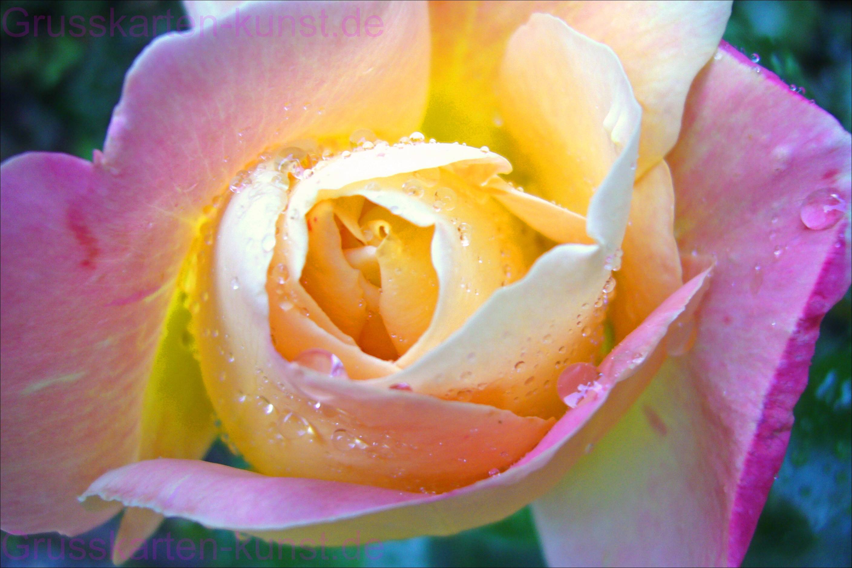 | B 54 Sie sehen die sich öffnende Knospe einer Glria dei Edelrose im Morgentau. Einige Wassertropfen "kleben" noch an den zarten Blütenblättern. Die äußerste Lage der Blütenblätter ist schon geöffnet, der innere Teil beginnt sich zu öffnen. Die Rose hat eine warm-gelbe Grundfarbe und tendiert an den äußeren Blütenblättern zu einem apricot Farbton. Hier wurden die Farben mit einem Bildbearbeitungsprogramm bewusst überzeichnet, so entsteht ein "Look" like Warhols Marylin". Knallig, poppig, betörend. Mail mit der Karte B54 versenden Karte B54 vergrößern | |