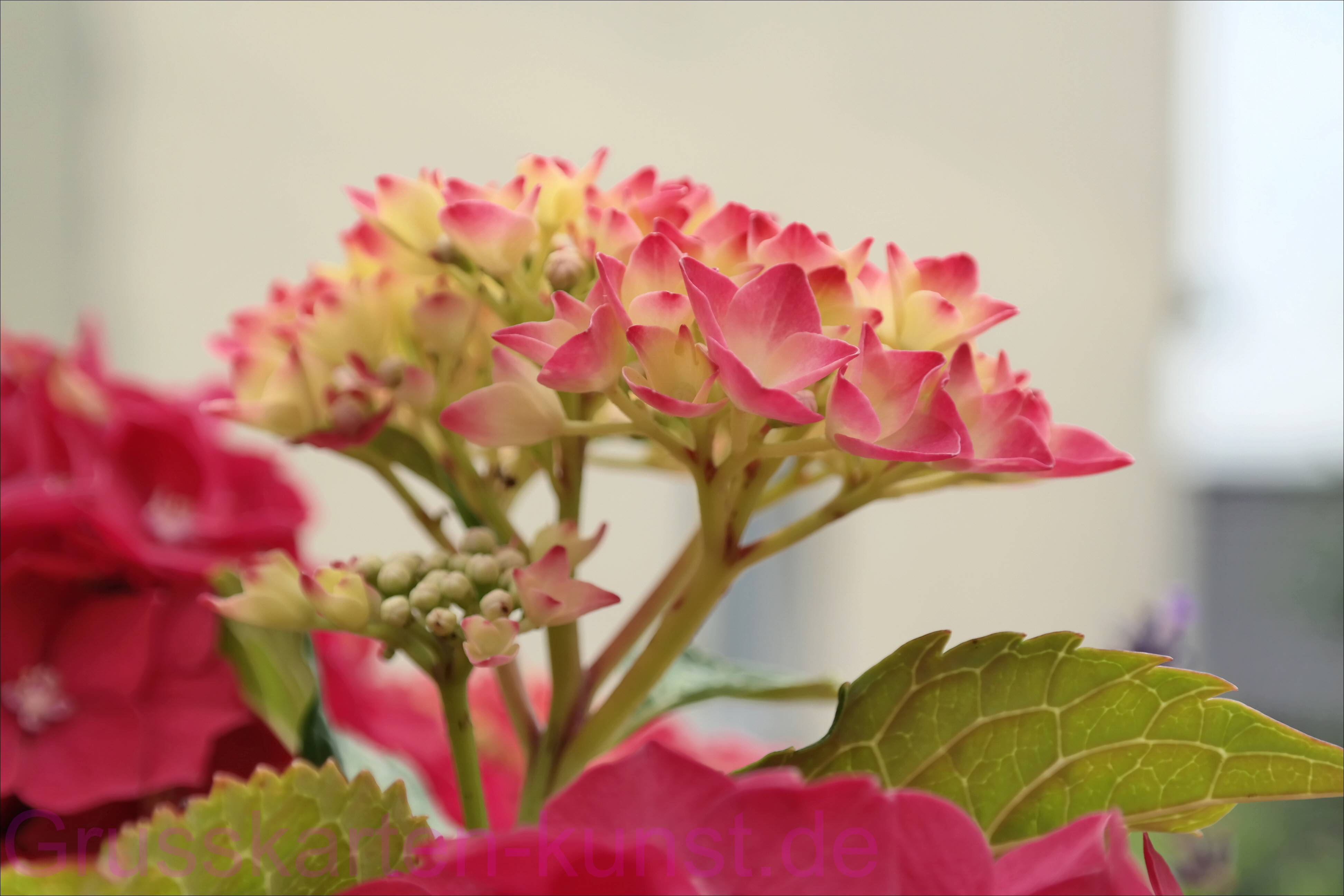 | B 55 Waagrecht auf eine pinkfarbene, sich öffnende Hortensienblüte fotografiert. Im Vordergrund rahmen zwei in voller Blüte stehende Ausschnitte der kugeligen Blütenbälle das Motiv ein. Die komlett aufgegangenen Blüten bestehen aus vielen Einzelblüten die auf sich immer weiter verästelnden Stielen stehen. Hier haben sich noch nicht alle Einzelblüten geöffnet und die Farbe ist noch nicht voll entfaltet, sodass cremefarbige und pinke Blütenblättchen sich abwechseln. Ein unscharfer, buttergelber Hintergrund gibt dem Ganzen einen edlen Charakter. Mail mit der Karte B55 versenden Karte B55 vergrößern | |