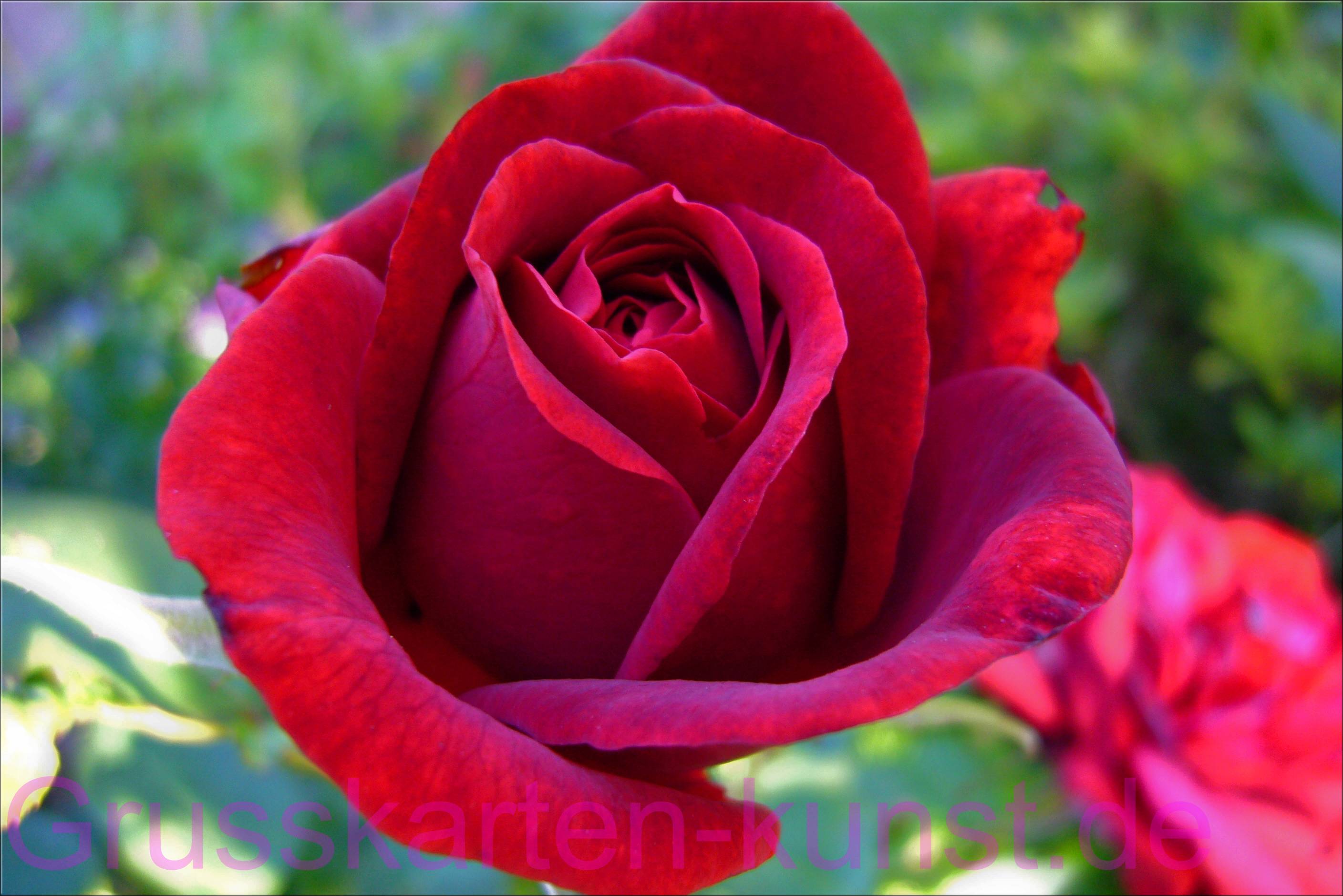 | B21 Hier sehen Sie die Makroaufnahme einer feurig roten Rose mit dem Namen Bad Bergzabern. Die leicht schräg ausgeführte Fotografie, zeigt Licht und Schatten zwischen den einzelnen sich langsam öffnenden Blütenschalen. Die inneren Blütenschalen sind noch wie eine Papierrolle zylinderförmig geschlossen. Ein wenig Nässe auf den Blättern verleiht einen leichten Glanz. Rand der Karte ist weiß verziert. Edel schön. Mail mit der Karte B21 versenden Karte B21 bestellenKarte B21 vergrößern | |