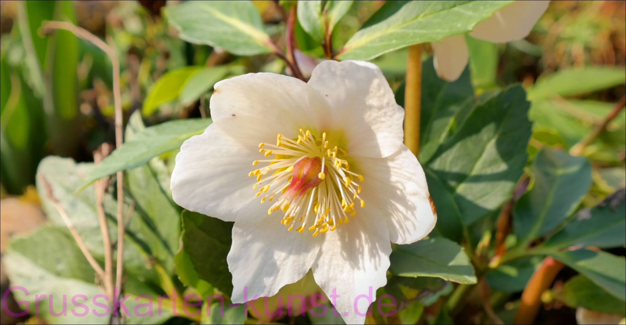 | B57 Diese weiße Christrose mit gelben Staubfäden blüht bereits im Januar bis März. Sie hat 6 Blütenblätter die hier von der Sonne beschienen werden. Die Pollen an den relativ langen Staubfäden werfen einen leichten Schatten. Im Hintergrund ist das Blattgrün zu sehen. Ein schöner Start in den Frühling. Mail mit der Karte B57 versenden Karte B57 vergrößern | |