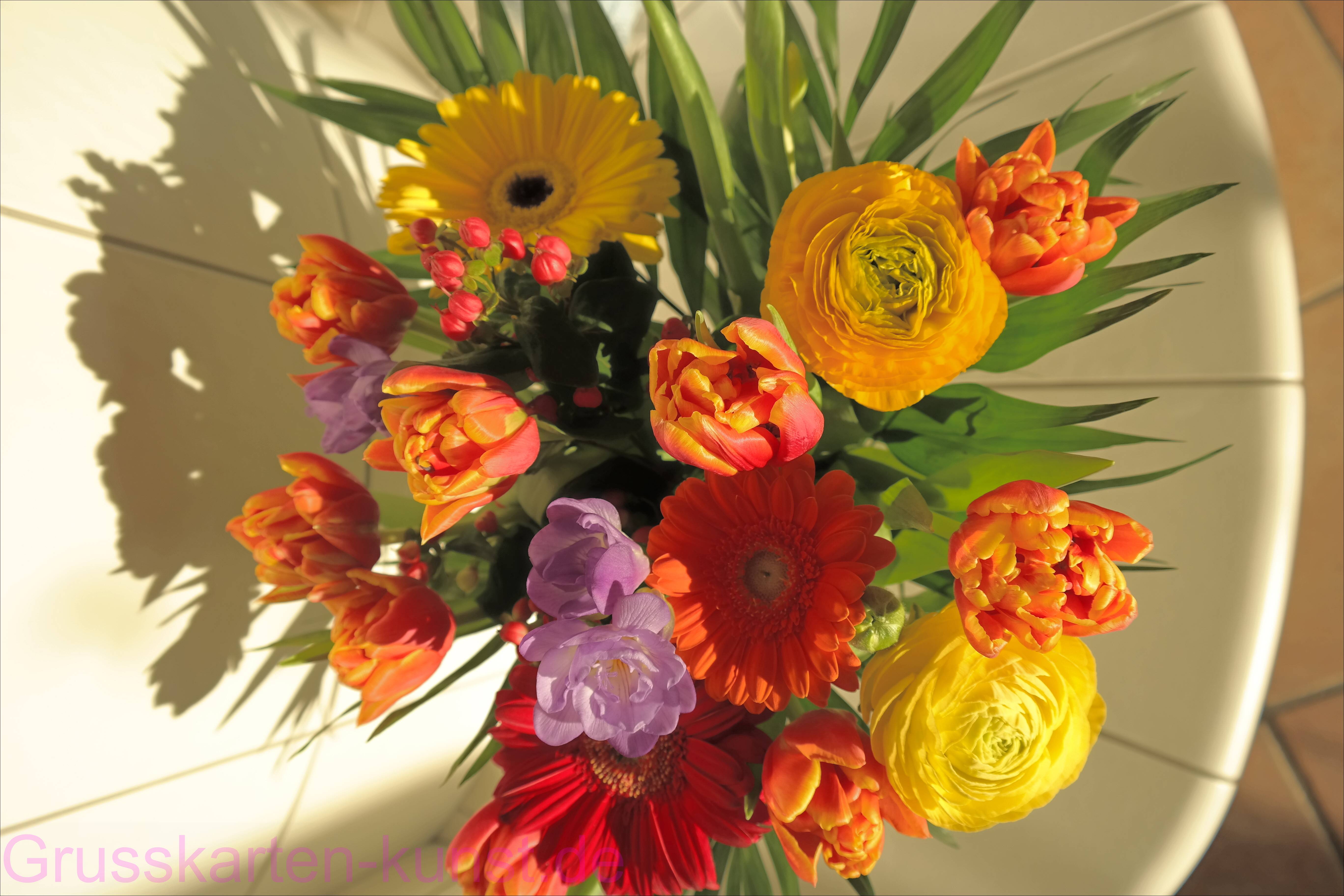 | B58 Knackfrischer Blumenstrauß in Gelb - Orange - und Rottönen aus Gerbera, Ranunkeln, Tulpen und Hypericum, dazwischen Blattgrün und ein Hauch von lila Fresien. Das Ensemble ist von oben fotografiert, wird von einer tiefstehenden Sonne in leuchtendes Licht versetzt und steht auf einem cremefarbigen Hintergund, der am rechten Rand einen mondsichelförmigen Abschluss hat. Stimmungsaufheller Mail mit der Karte B58 versenden Karte B58 vergrößern | |