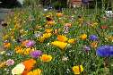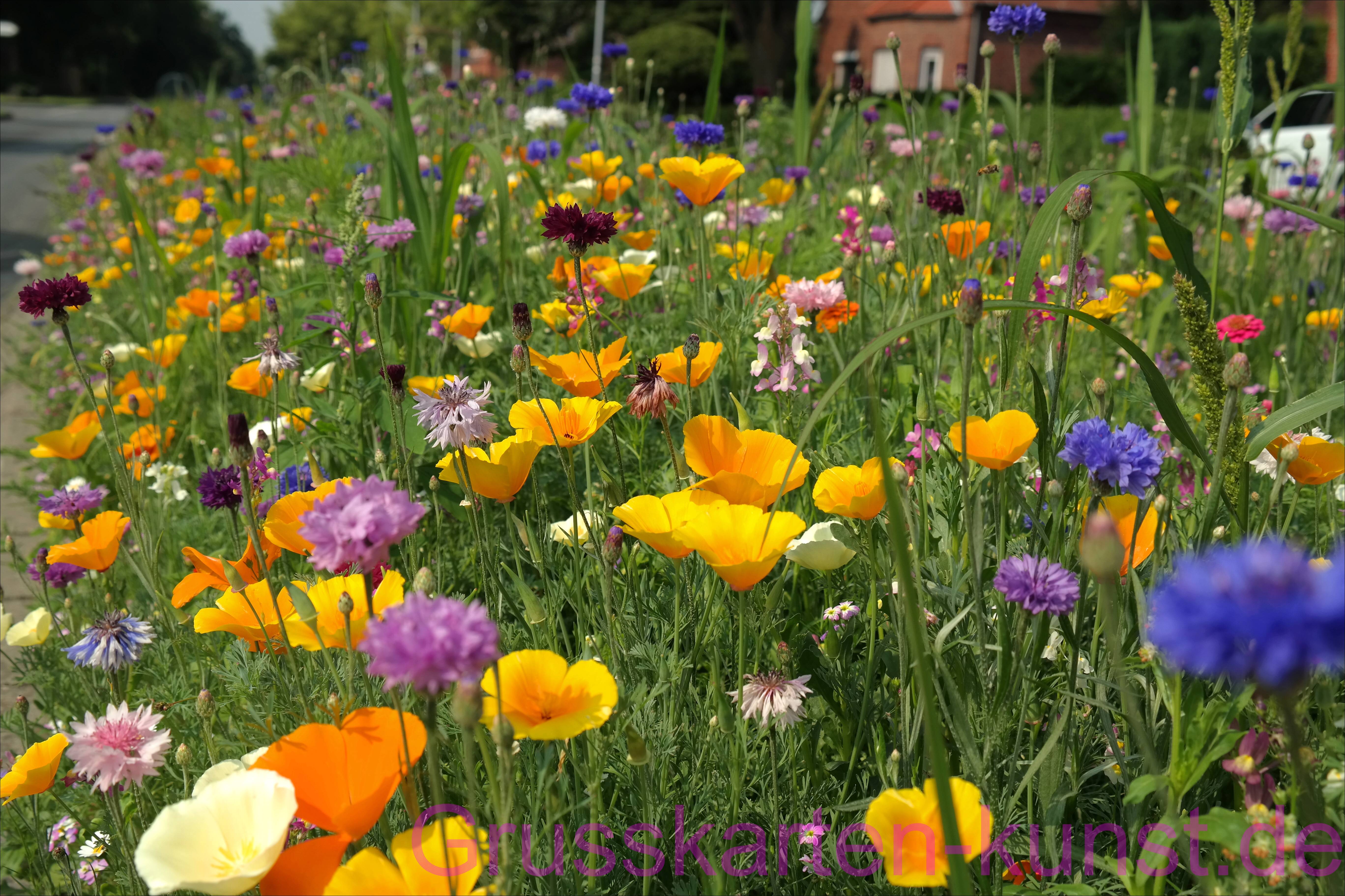 | B61 Immer öfter werden verkehrsinseln bepflanzt. Hier sehen Sie in Schrägansicht eine knallbunte Sommerblumeninsel. Cremeweiße, Orangene, Violette, Gelbe und Blautöne dominieren diese Karte. Kornblumen, Mohn-, Butter-, Ringel- und andere zierliche Blüten explodieren auf diesem Bild. Mail mit der Karte B61 versenden Karte B61 vergrößern | |