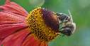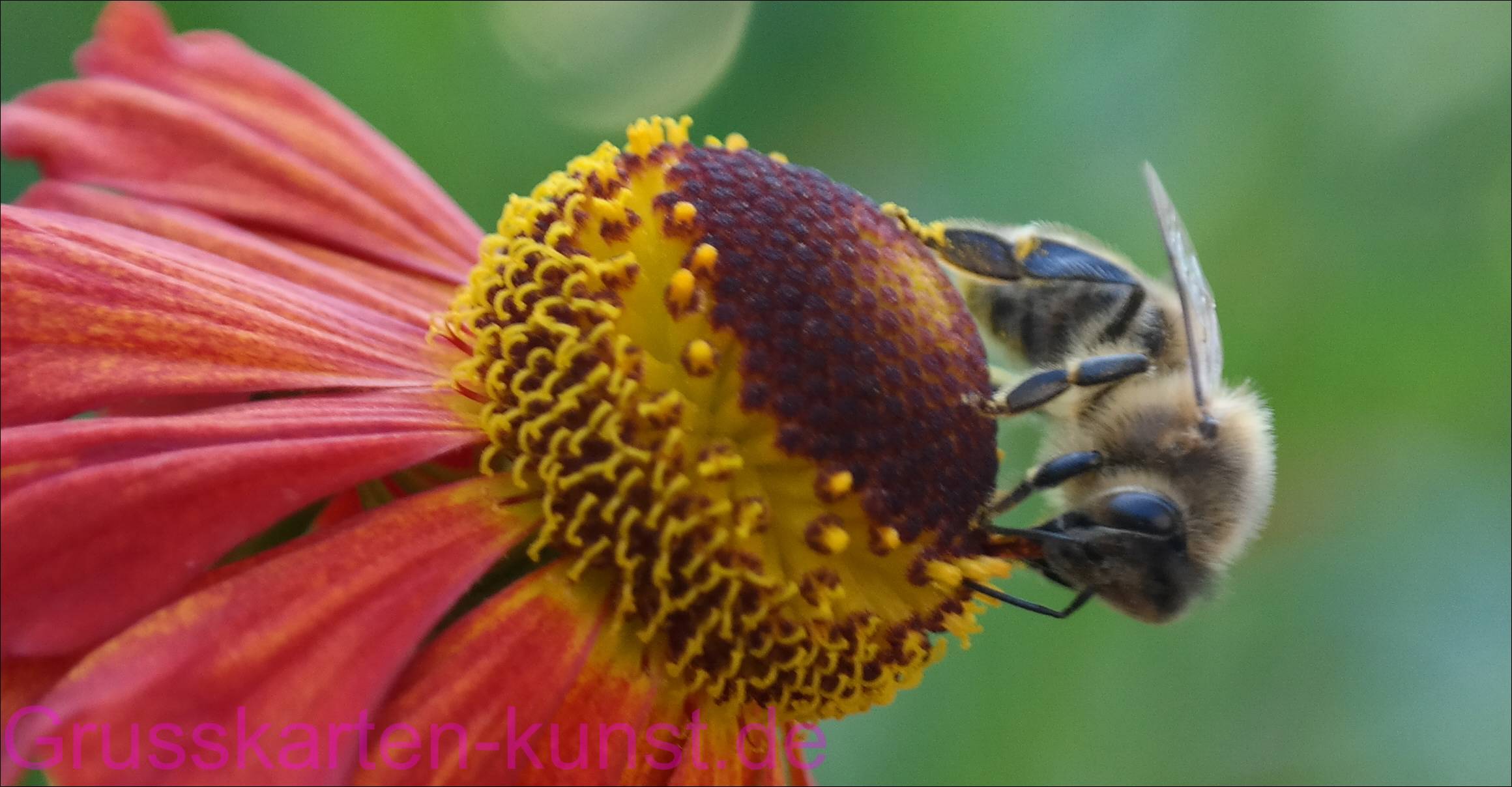 | B62 Eine rotorangefarbene Blüte der Sonnenbraut reckt sich von links unten diagonal ins Bild. Im Zentrum der Karte sieht man den Fruchtstand/Stempel der Blüte, der die Größe einer Haselnuss hat. Am Rand ist er goldgelb mit Pollen besetzt. Die Stirnseite ist dunkel purpur rot. Hierauf sitzt kopfüber eine Biene, die mit ihrem Mundwerkzeug Pollen sammelt und am Bein abstreift. Deutlich sieht man den beharrten Körper vor einem verschwommenen sattgrünen Hintergrund. Mail mit der Karte B62 versenden Karte B62 vergrößern | |