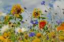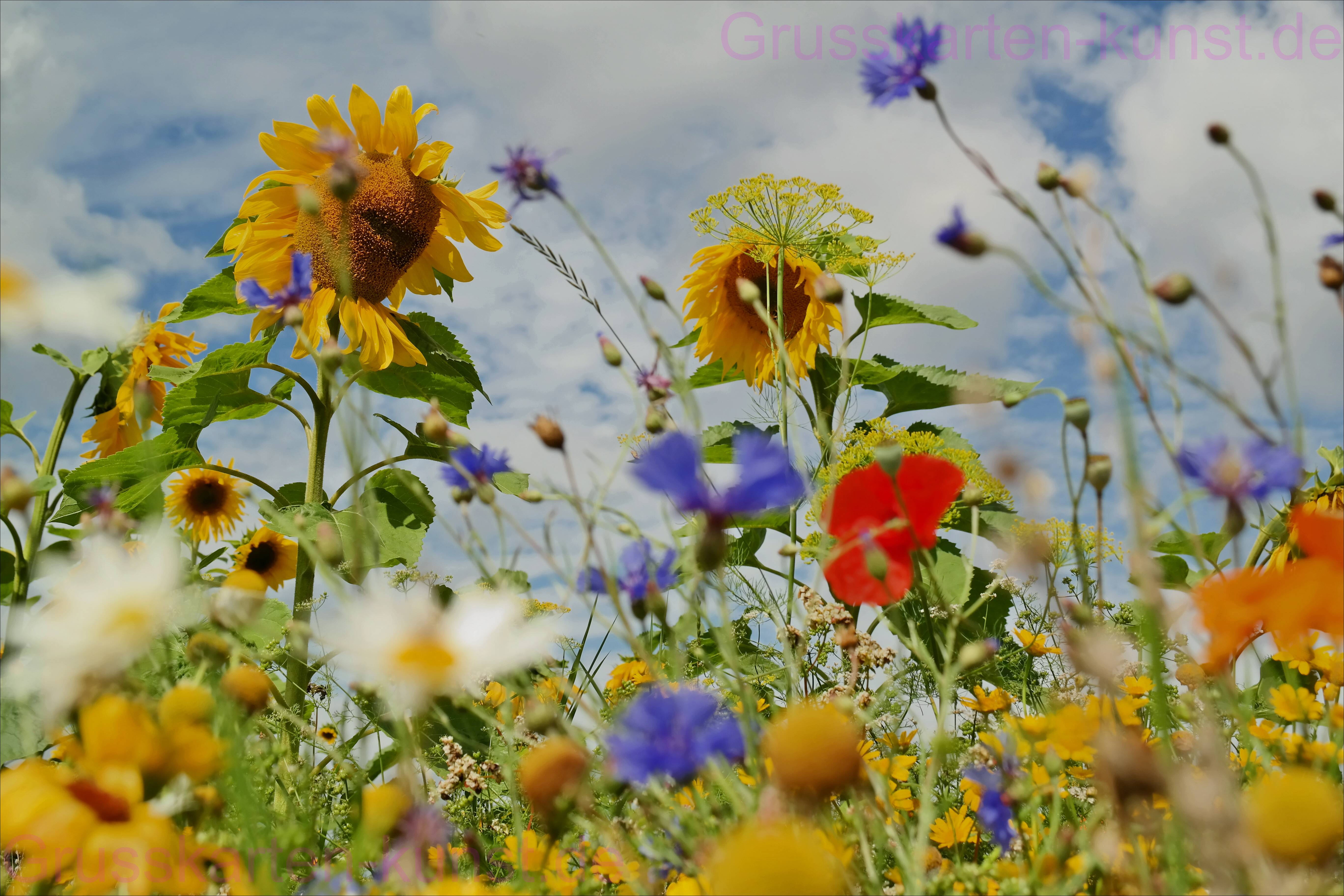 | B63 Ein wildes Sonnenblumen-Ringelblumen-Kornblumen-Mohnblumen-Margeriten-Gräser Feld aus der Froschperspektive. Gelb-orange, blau, weiß, rot sind die unscharf gehaltenen niedrigen Blumen im Vordergrund zu sehen, während sich im Hintergrund scharf und zum blau-weiß bewölkten Himmel hin, einige Sonnenblumen zum Betrachter hin wenden. Einfach wild. Mail mit der Karte B63 versenden Karte B63 vergrößern | |