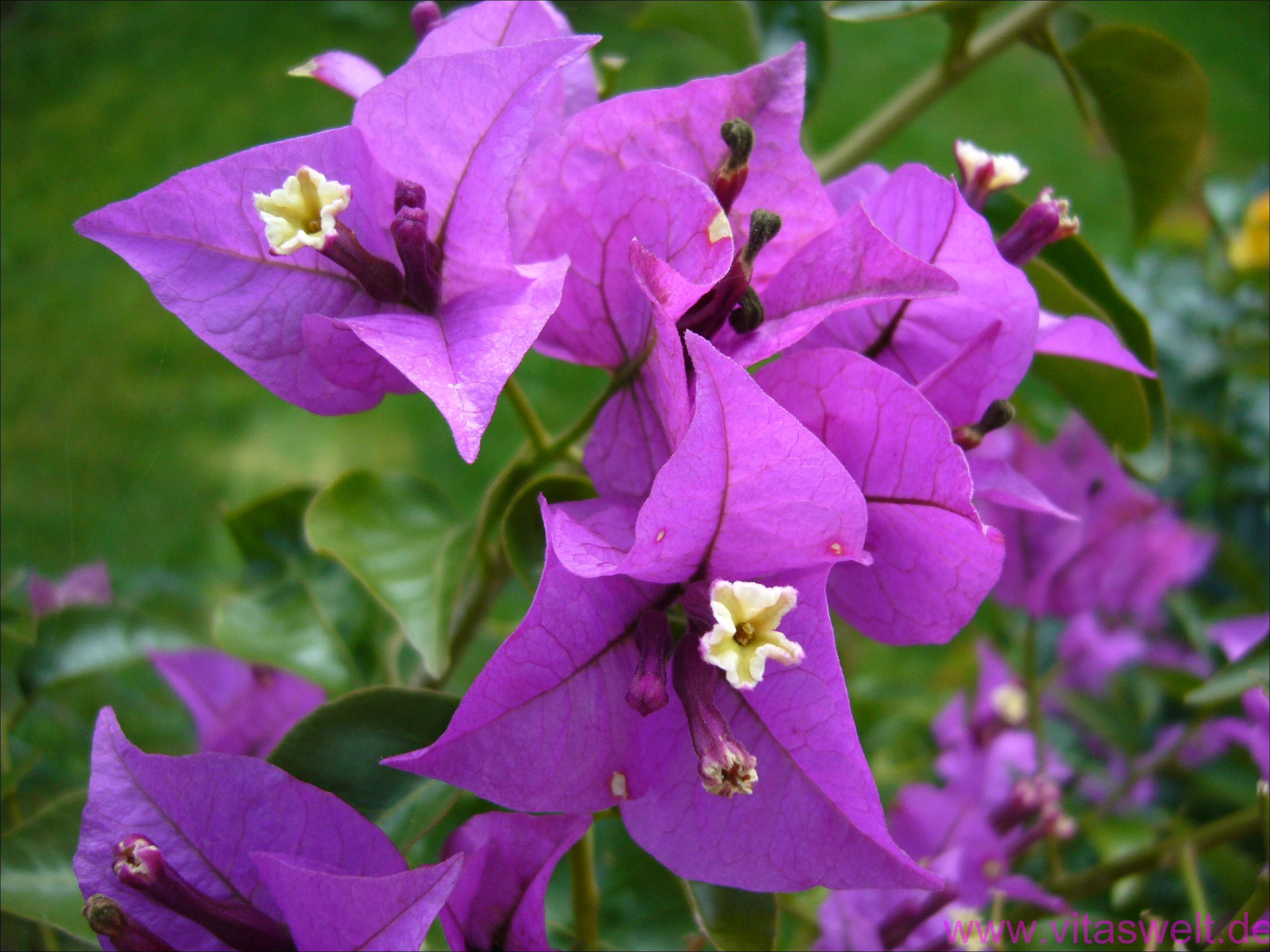 | B07 Nahaufnahme mehrerer lilafarbener Bouganvilleablüten. In der Mitte sahnegelber Blütenpollenstand. Hintergrund verschwommen grasgrün. Mail mit der Karte B07 versenden Karte B07 bestellen Karte B07 vergrößern | |