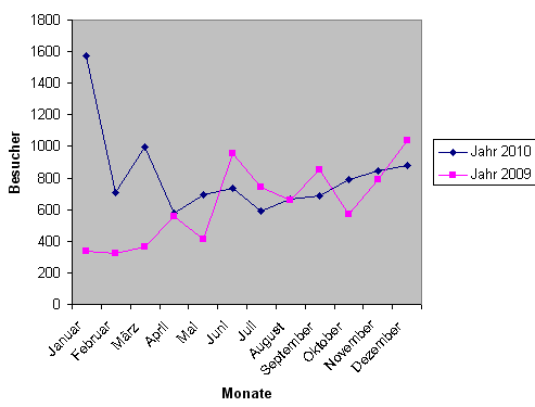 | 01/ 2010: 1573 Besucher 01/2011 : 914 18240 02/ 2010: 705 Besucher 02/2011 : 822 19062 03/ 2010: 997 Besucher 03 2011: 745 19807 04/ 2010: 577 Besucher 04/2011: 626 20433 05/2010: 697 Besucher 05/2011: 753 21186 06/2010: 734 Besucher 06/2011: 649 21855 07/2010: 588 Besucher 07/2011: 607 22462 08/2010: 666 Besucher 08/2011: 714 23176 09/2010: 684 Besucher 09/2011: 620 23796 10/2010: 788 Besucher 10/2011:710 24506 11/2010: 843 Besucher 11/2011: 616 25122 12/2010: 879 Besucher 12/2011: 1040 26162 Gesamt 2010: 9741 Besucher Zählerstand 17326 Gesamt 2011: 8836 Besucher ![]() Februar 2009: 320 Besucher März 2009: 364 Besucher April 2009: 556 Besucher Mai 2009 : 412 Besucher Juni 2009 : 953 Besucher Juli2009: 739 Besucher August 2009: 659 Besucher September 2009: 854 Besucher Oktober 2009: 572 Besucher November 2009: 789 Besucher Dezember 2009: 1039 Besucher Gesamt 2009: 7595 Besucher | |