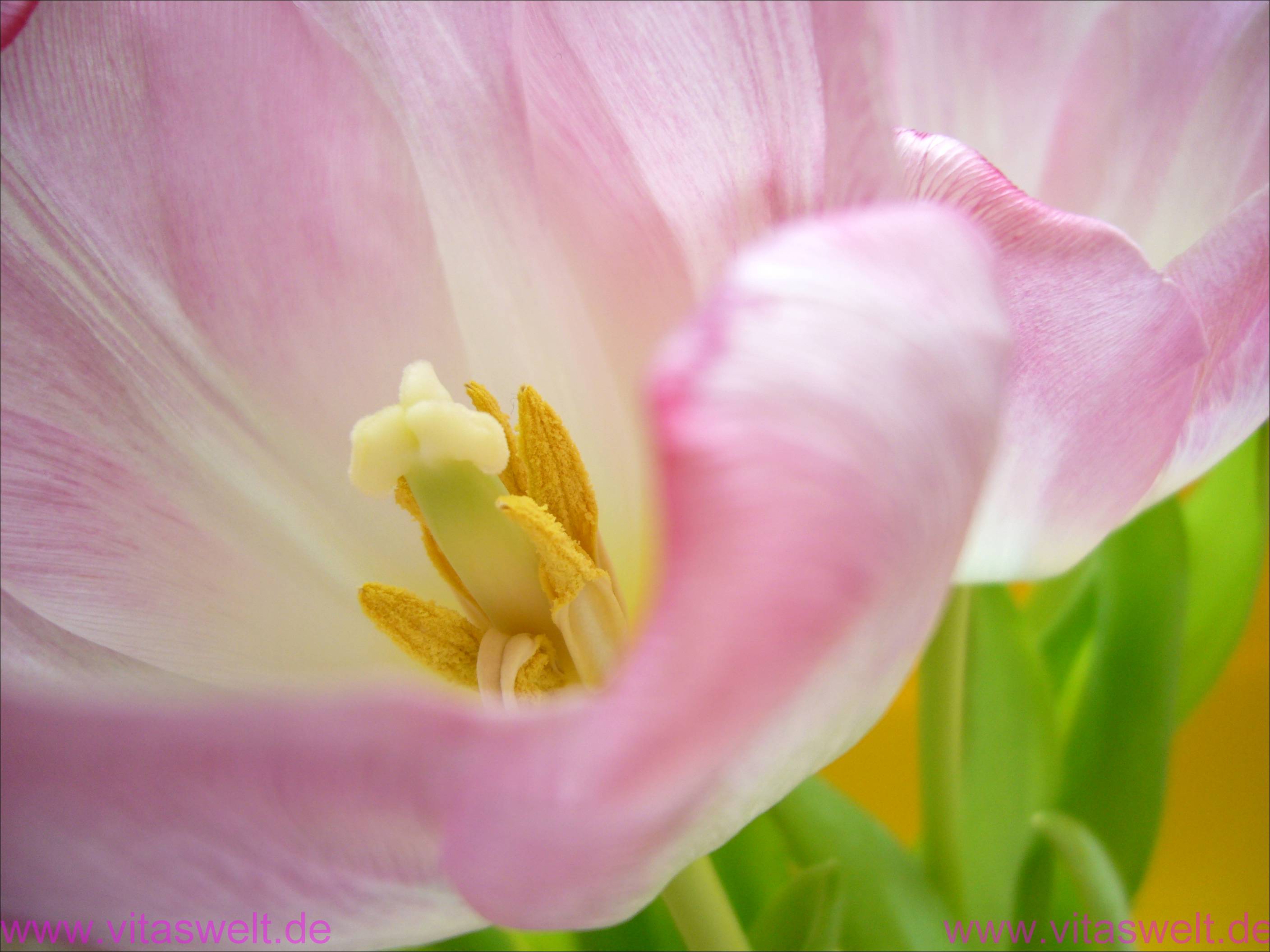 | V12 Schräger Einblick in eine rosafarbene, offene Tulpenblüte. Die Makroaufnahme zeigt den pollenbesetzten, gelben Blütenstempel. Um diesen herum gruppieren sich die rosa-weiß geäderten Blütenblätter. Am rechten unteren Bildrand sieht man Teile der saftiggrünen Blätter vor gelbem Hintergrund. Majestätisch. Mail mit der Karte V12 versenden Karte V12 bestellen Karte V12 vergrößern | |