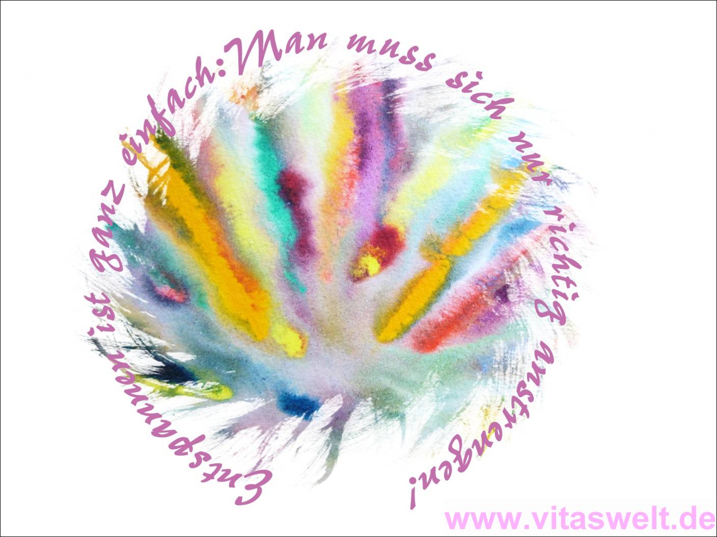 | V18 "Entspannen ist ganz einfach- man muss sich nur richtig anstrengen!" Im Kreise herum geschrieben auf weißem Hintergrund. In der Mitte von innen nach außen kreisförmig verlaufende Striche in vielen Farbtönen(wirkt hell). Die Kreisform franst nach außen leicht aus, so entsteht ein dynamischer Eindruck. Aquarell. Mail mit der Karte V18 versenden Karte V18 bestellen Karte V18 vergrößern | |