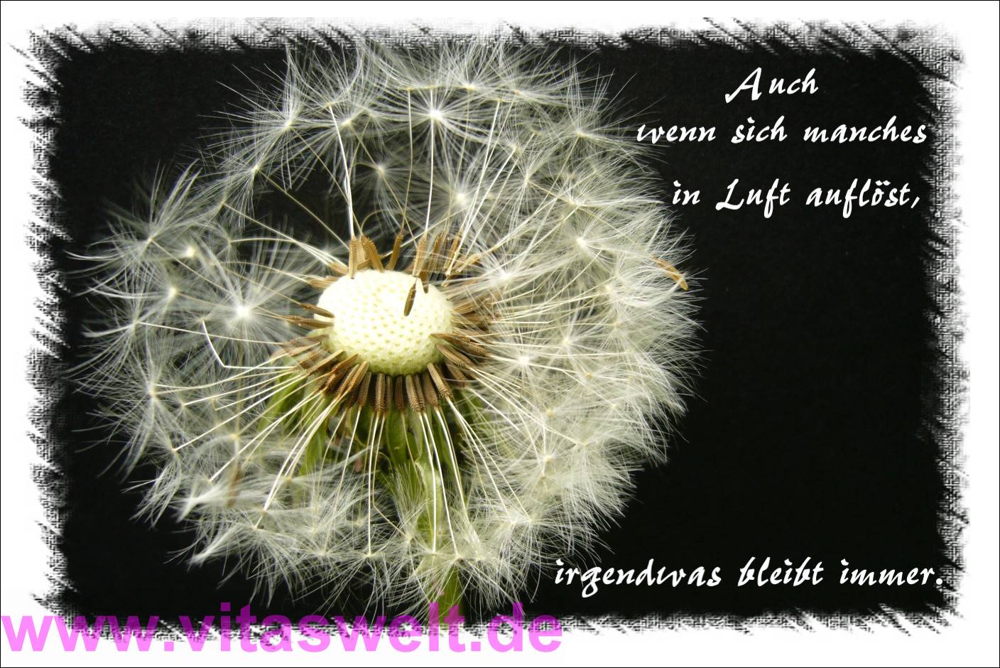 | V19** " Auch wenn sich manches in Luft auflöst, irgendwas bleibt immer." Weiß geschrieben in Schreibschrift auf schwarzem Hintergrund. Makroaufnahme einer Pusteblume. In der Mitte sieht man den hellen Blütenstempel, auf dem sich ringsherum die länglich- braunen Sämchen mit ihren filigranen, haarähn-lichen Fallschirmchen befinden. Auf der Stempelmitte fehlen schon einige Sämchen, sodass man die Porenähnlichen Löcher sieht, in denen die Sämchen ihren Halt hatten. Der Hintergrund ist schwarz, um den Kontrast zu dem grau-weißen Blütenball zu erhöhen. Ein wenig leuchtet die gezackte, grüne Rosette und der Stängel hervor. Der Kartenrand ist, wie von Kreidestrichen gemalt, ungerade. Toller Anblick! Mail mit der Karte V19 versenden Karte V19 bestellenKarte V19 vergrößern | |