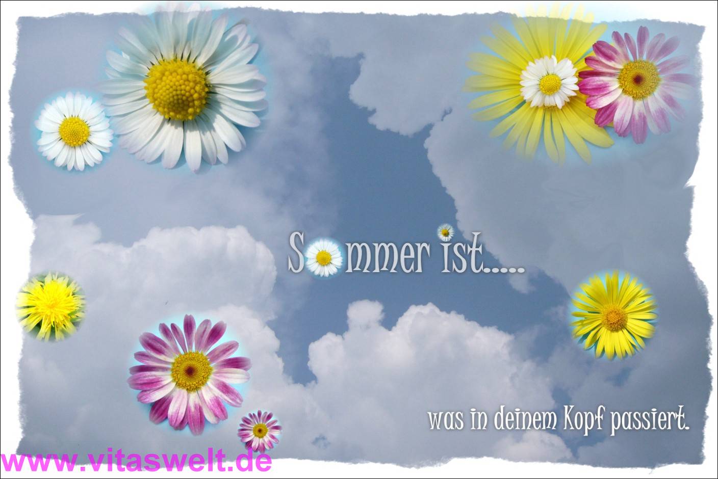 | V21 "Sommer ist... was in deinem Kopf passiert." Fotografie eines mit Kumuluswolken bewölkten Himmels mit einer blauen Wolkenlücke im Zentrum des Bildes. Die Wolken scheinen von verschiedenen Seiten in das Bild zu ragen. Sie haben scharfe Ränder und verschiedene Weiß-Hellgrau-Dunkelgrautöne. Der Anfang des Spruches steht weiß im zenetralen blau, das Ende unten rechts. Die Karte hat einen wolkigen Rand. Auf die Wolken sind in verschiedenen Größen Gänseblümchen, gelbe und weißpinke Margeriten, sowie ein Löwenzahn "drapiert". Es sind lediglich die Blütenköpfe zu sehen. Das O in "Sommer" und der i -Punkt bei "in" wurde mit einem Gänseblümchen geschrieben. Mail mit der Karte V21 versenden Karte V 21 bestellen Karte V21 vergrößern | |
