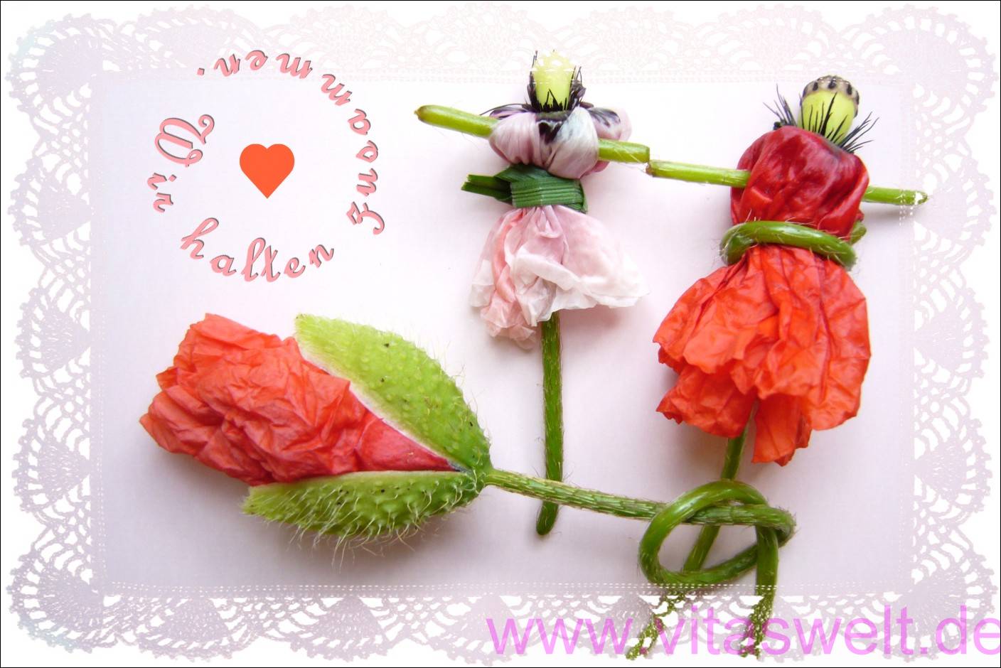 | V23 "Wir halten zusammen" steht in rosa Schrift rund um ein rotes Herz links oben auf der Karte. Auf pastellrosa Hintergrund liegen zwei "Mohnpüppchen, die Händchen halten, und eine Mohnknospe, aus der gerade die rote Blüte platzt. Die Püppchen entstehen, indem man die offene Blüte nach unten um den Stiel klappt und sie mit einem Grashalm als Gürtel zusammen bindet. Der Kopf ist das oben stehende Samenkörbchen und die Arme entstehen dadurch, dass man ein Hälmchen durch den oberen Teil des Blütenkleidchens steckt. Ein Mohnpüppchen ist aus rosa- eins aus rotem Mohn geformt. Einfach süß. Von Tanja. Mail mit der Karte V23 versenden Karte V23 bestellenKarte V23 vergrößern | |