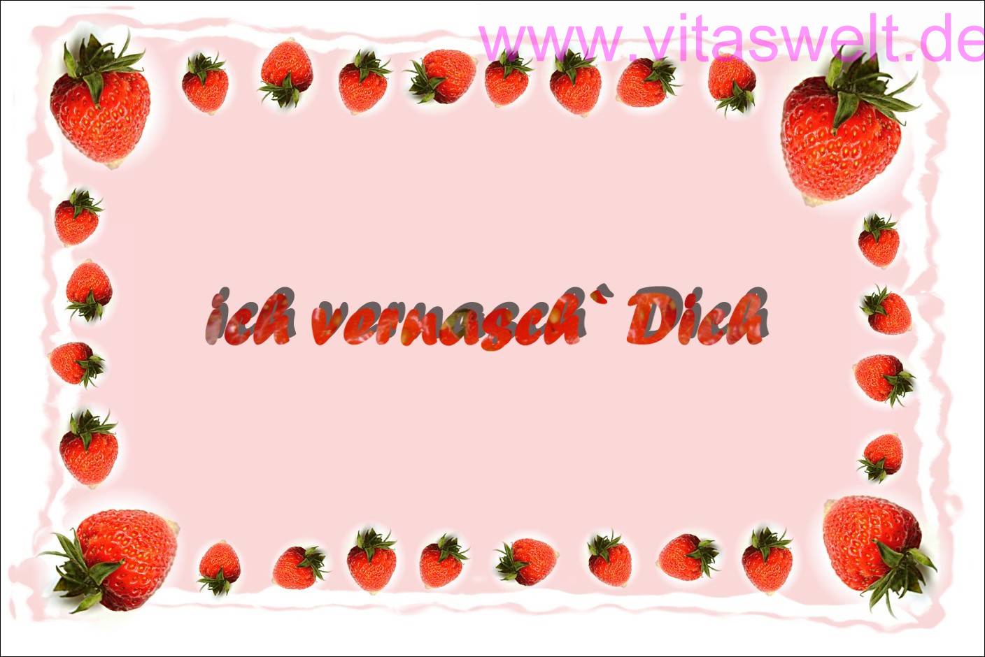 | V24 Eine cremerosa Karte mit gebrochenem, weißem Rand . Um das pastellfarbene Rechteck herum befindet sich jeweils in der Ecke eine große, rote Erdbeere mit Blattgrün . Von Ecke zu Ecke purzeln jeweils auf einer Linie, mehrere kleine Erdbeeren herum. Sieht lustig und schmackhaft aus. Der Spruch der Karte konnte in einem Kreativspiel von unseren Besuchern vorgeschlagen werden. Gewonnen hat Tanja H. mit folgendem Spruch: "ich vernasch` Dich..." steht in der Mitte Mail mit der Karte V24 versenden Karte V24 bestellen Karte V24 vergrößern | |