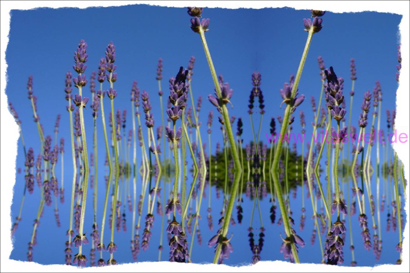 | V26 Phantastische Abbildung von Lavendelblütenrispen vor einem strahlendblauen Himmel. Die Rispen ragen mit ihren grünen, unterschiedlich langen Stängeln und lilafarbenen Blüten, leicht schräg in die Karte hinein. Auf dem Boden liegend habe ich in den Himmel fotografiert und dabei ein Stück grün belaubte Baumwipfel erwischt. Mit einer PC gesteuerten Spiegelung habe ich im goldenen Schnitt gespiegelt. D.h. es entsteht eine zweifache Klapp-spiegelung im unteren und rechten Drittel. Dadurch sieht das ganze aus, wie eine Spiegelung von Pflanzen an einem glasklaren See, dessen Rand mit etwas grünem Bewuchs umsäumt ist. Der Kartenrand ist wie abgerissen. Super! Mail mit der Karte V26 versenden Karte V26 bestellenKarte V26 vergrößern | |