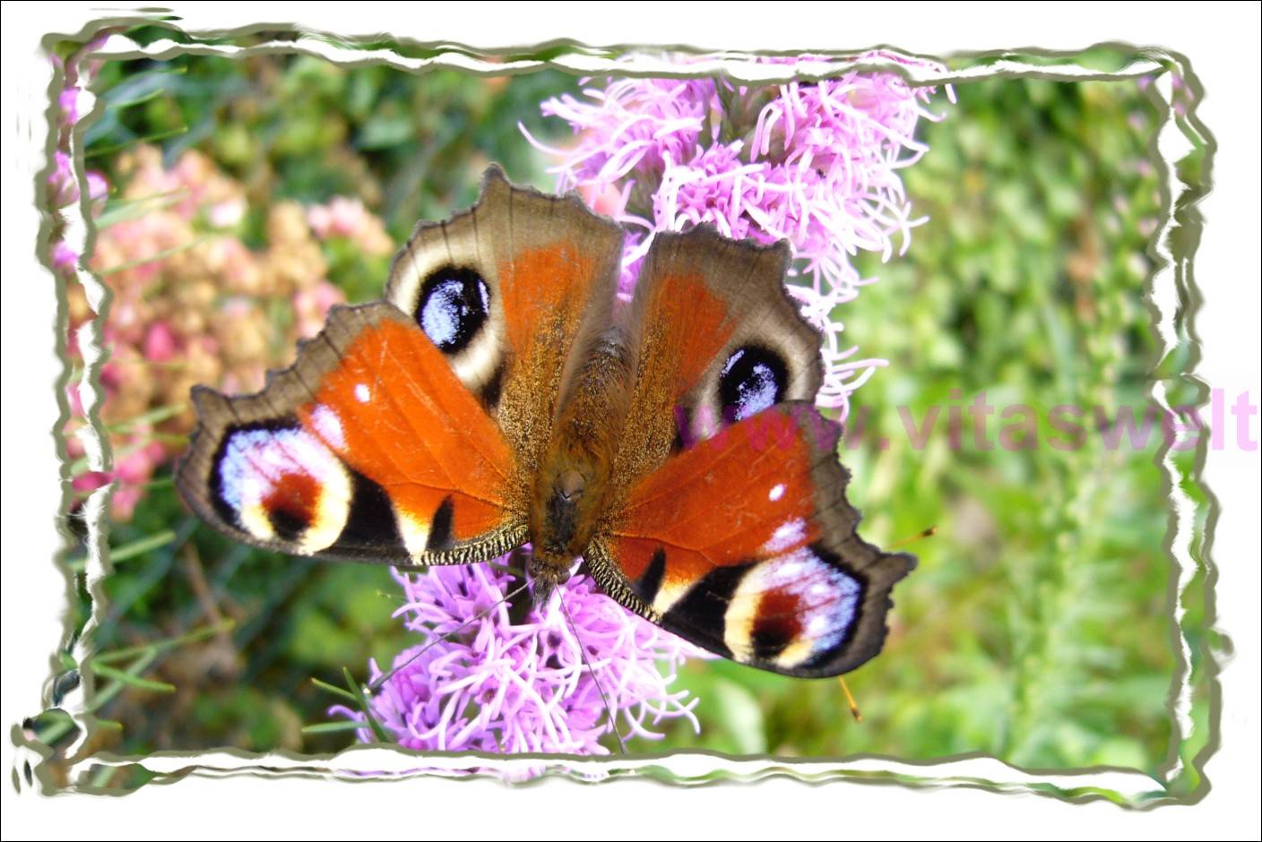 | V27 Vor einem verschwommenen, grün-bräunlichem Hintergrund sitzt ein Schmetterling (Tagpfauenauge) auf der sich senkrecht nach oben streckenden Blüte einer hell-lila Prachtspiere. Diese Blume ragt einem Besenstiel ähnlich ca. einen Meter aus der Erde empor. Die Blüte besteht aus lauter feinen Häärchen, die sich wie ein Teppichflor um den Stängel schmiegen. Der Edelfalter hat eine rostrote Grundfärbung. Die offenen Flügel- links und rechts je zwei- haben jeweils deutlich erkennbare schwarz-gelb-blaue „Augenflecken“. Der Flügelrand ist bräunlich. Die feinen Häärchen und Fühler sind deutlich zu erkennen. Die Spiegelgleichen Seiten sind ein Wunder der Natur. Mail mit der Karte V27 versenden Karte V27 bestellenKarte V27 vergrößern | |