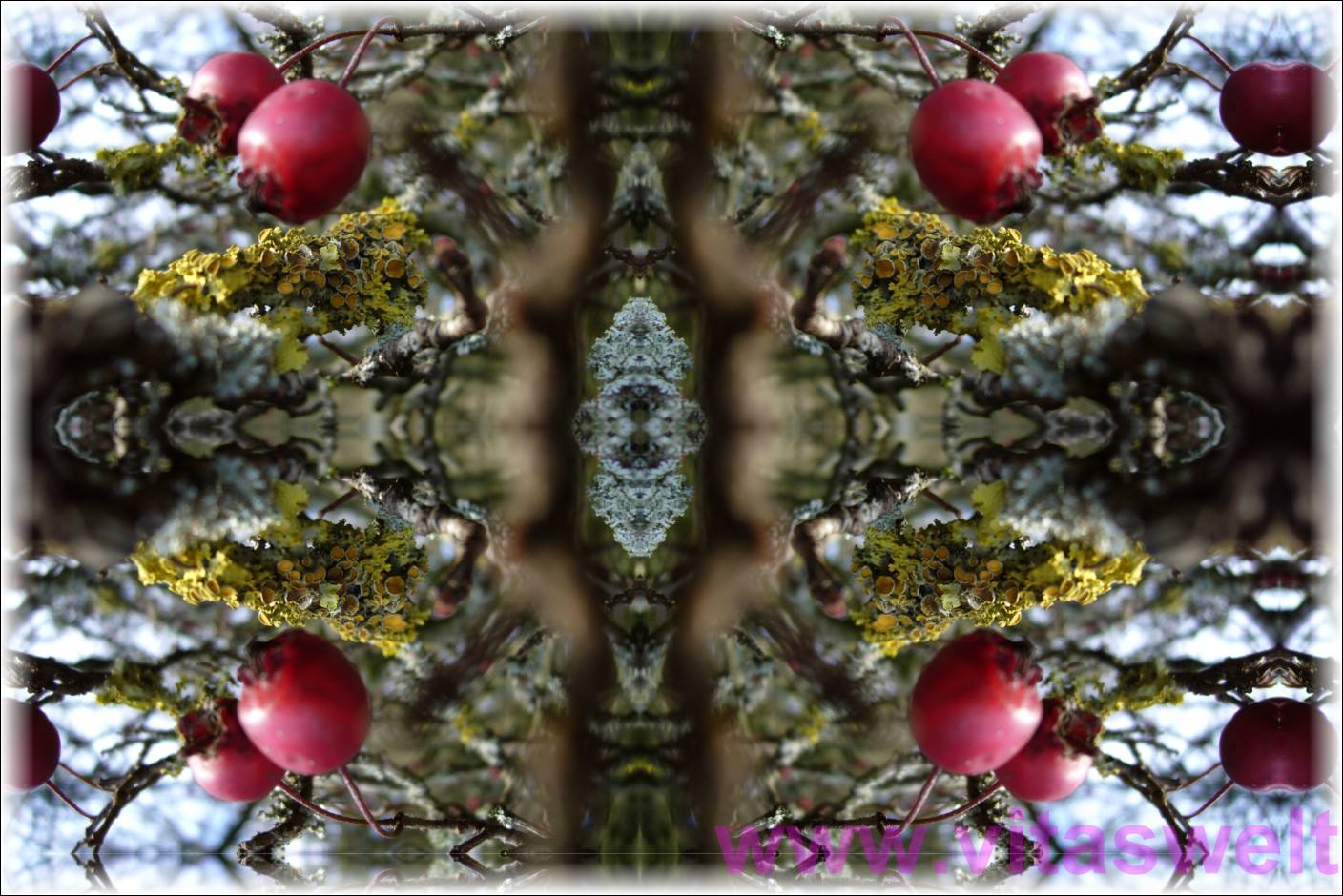 | V28 Vierfache Spiegelung einer Nahaufnahme von einer roten Frucht des Weißdorns. Der Busch ist übersät von Pilzartigen gebilden, der sich wie Schorf um die Äste legt. Graublaue und gelbgrüne Pilzgebilde sehen in dieser Nahaufnahme aus, wie Krater eines entfernten Planeten. Das stark verästelte Buschwerk, welches nun blattlos dasteht wirkt so betrachtet wie aus einer fremden Welt. Die Spiegelung befindet sich mittig in der Horizontalen und Vertikalen, so entsteht fast der Eindruck, dass es sich um einen Schmetterling handeln könnte. In den 4 Ecken lugt der blaue Himmel durch die Verästelung. Von der Mitte nach außen hin überwiegen natürliche braun-gelb-grautöne, mit dem roten Blickfang in jedem Viertel. Das Auge wandert suchend hin und her. Gehirntraining für Sehende. Mail mit der Karte V28 versenden Karte V28 bestellen Karte V28 vergrößern | |