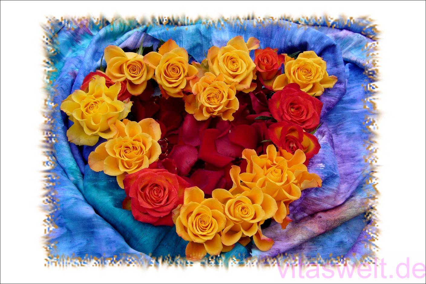 | V31 Ein Herz aus 15 gelb-orange-roten Rosen gesteckt. Die Draufsicht auf die halboffenen Blüten macht einen prallen, frischen Eindruck. In der Mitte liegen dunkelrote Blütenblätter und das gesamte Gesteck liegt auf einem Seidentuch mit verlaufenden Farben. Diese sind in Kornblumenblau- Hellblau und Lilatönen gehalten und geben so einen schönen Kontrast. Mail mit der Karte V31 versenden Karte V31 bestellenKarte V31 vergrößern | |