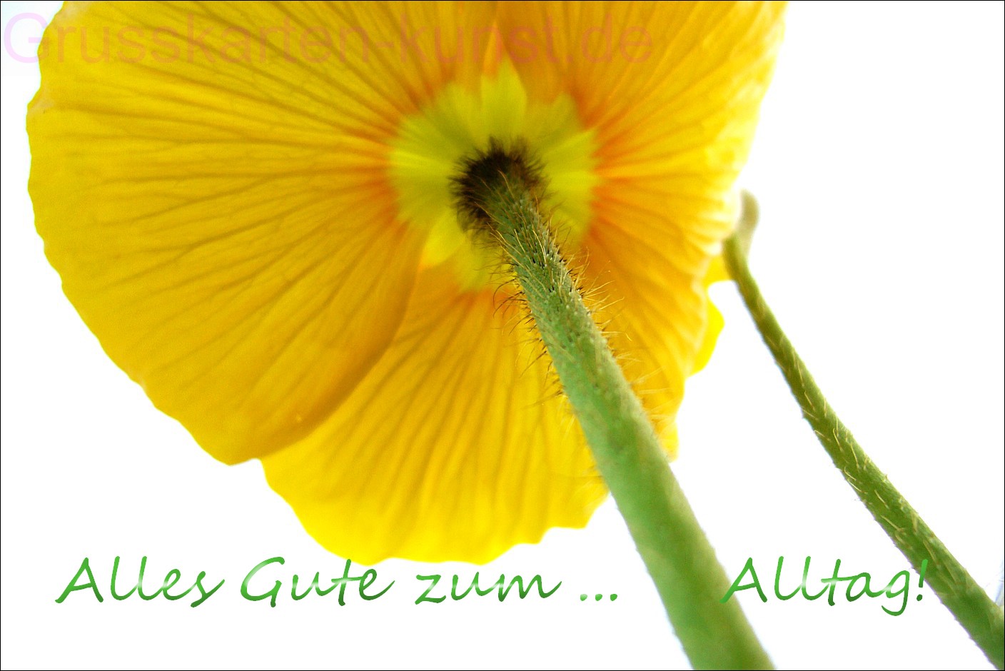 | V33 "Alles Gute zum.... Alltag" in grüner Schreibschrift am unteren Rand. Stellen Sie sich vor, Sie liegen unter einem Baum mit dem Gesicht zum Himmel. Dies ist die Perspektive dieser Karte, nur dass der Baumstamm ein haariger Stängel einer gelben Islandmohn Blüte, und die Baumkrone die geöffnete, schöne, warme Blüte ist. Der Hintergrund ist weiß, sodass die Blume wie aus dem Nichts zu erscheinen mag. Ungewöhnlich mit Stil. Mail mit der Karte V33 versenden Karte V33 bestellen Karte V33 vergrößern | |