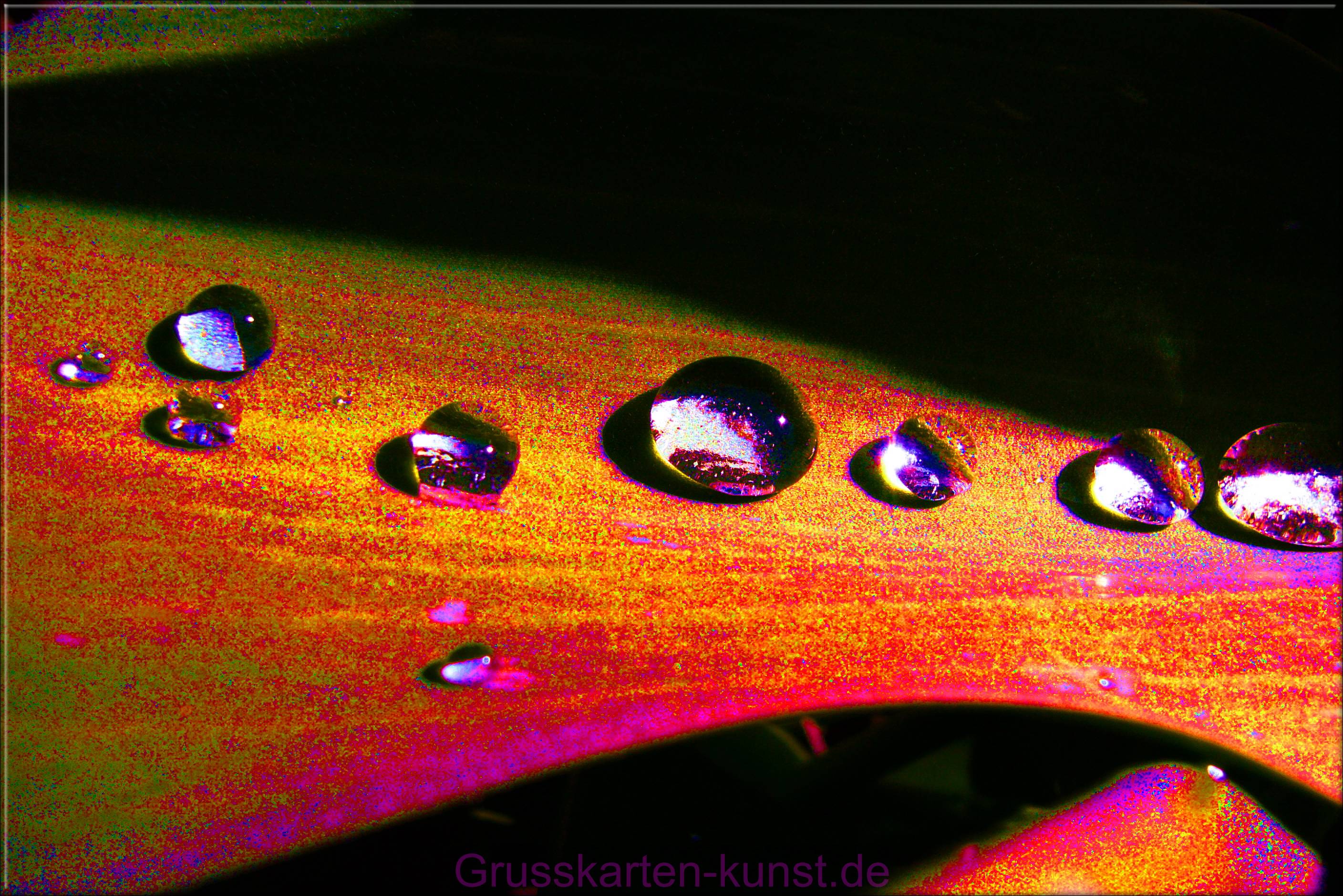 | V36 Wassertropfen verschiedener Größe perlen auf einem schräg von der Seite fotografiertem Tulpenblatt und spiegeln dern Glanz des Lichtes. Die natürlichen Farben wurden verfremdet, sodass die Komposition fremdartig, interessant, vielleicht wie von einem fremden Planeten? aussieht. Es herrschen rostrot und gelbviolettfarbene Töne vor einem schwarzen Hintergrund. Mail mit der Karte V36 versenden Karte V36 vergrößern | |