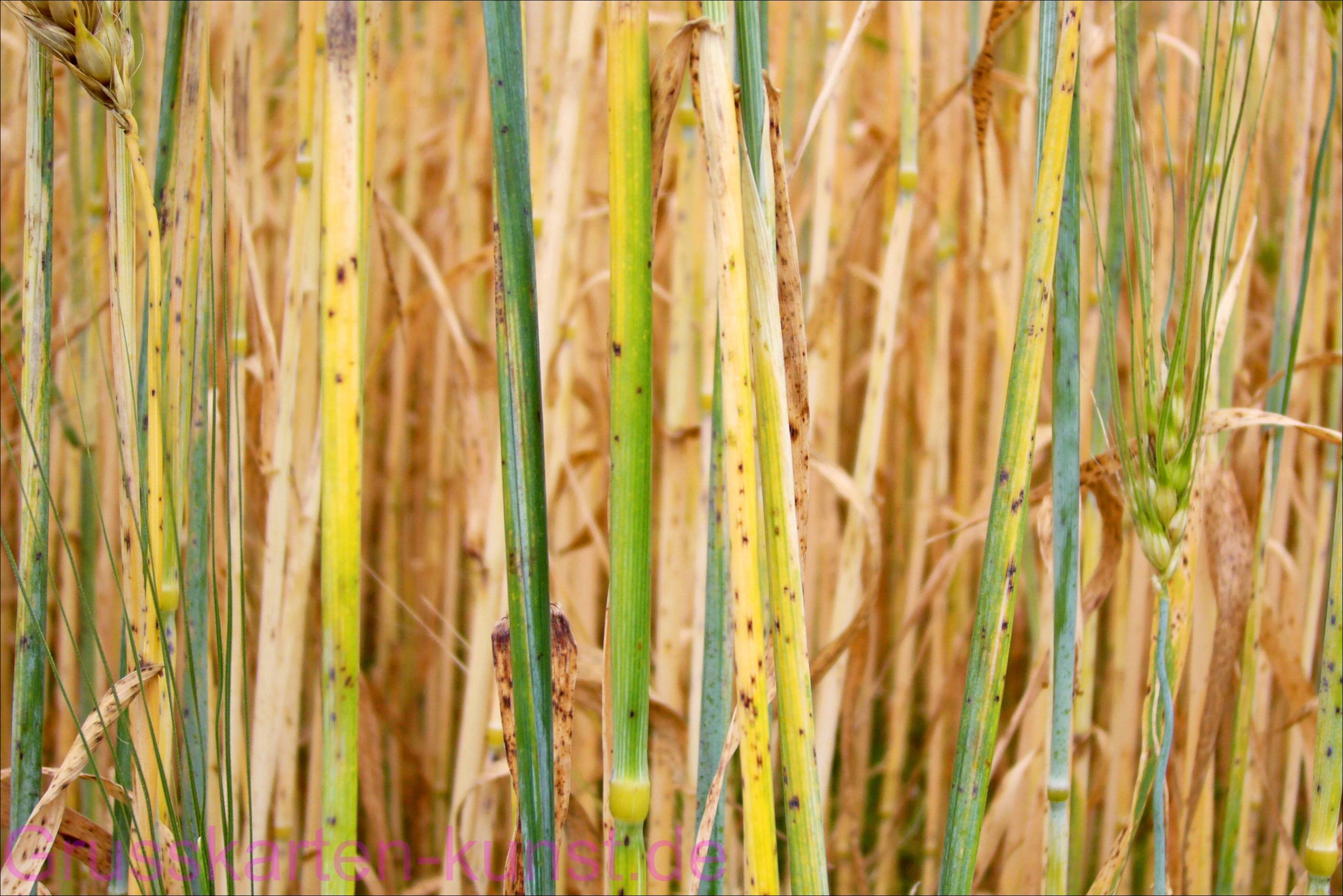 | V38 Was ist das? Ja, richtig, ein ungewöhnlicher Einblick in die senkrecht stehenden Halme der Gerste auf dem Acker. Nicht einfach goldgelb, wie man vermutet, sondern, kurz vor der Ernte stehend in türkies-grün-, rost- und Erdfarben. Die natürlichen braunen Flecken, an den dicht an dicht stehenden senkrechten Halmen, lockern die Stringenz auf. Im Streulicht fotografiert, ein fast farbenprächtiges Schauspiel, welches seine Herkunft durch einen einzigen, noch grünen Fruchtstand, verrät. Mail mit der Karte V38 versenden Karte V38 vergrößern | |