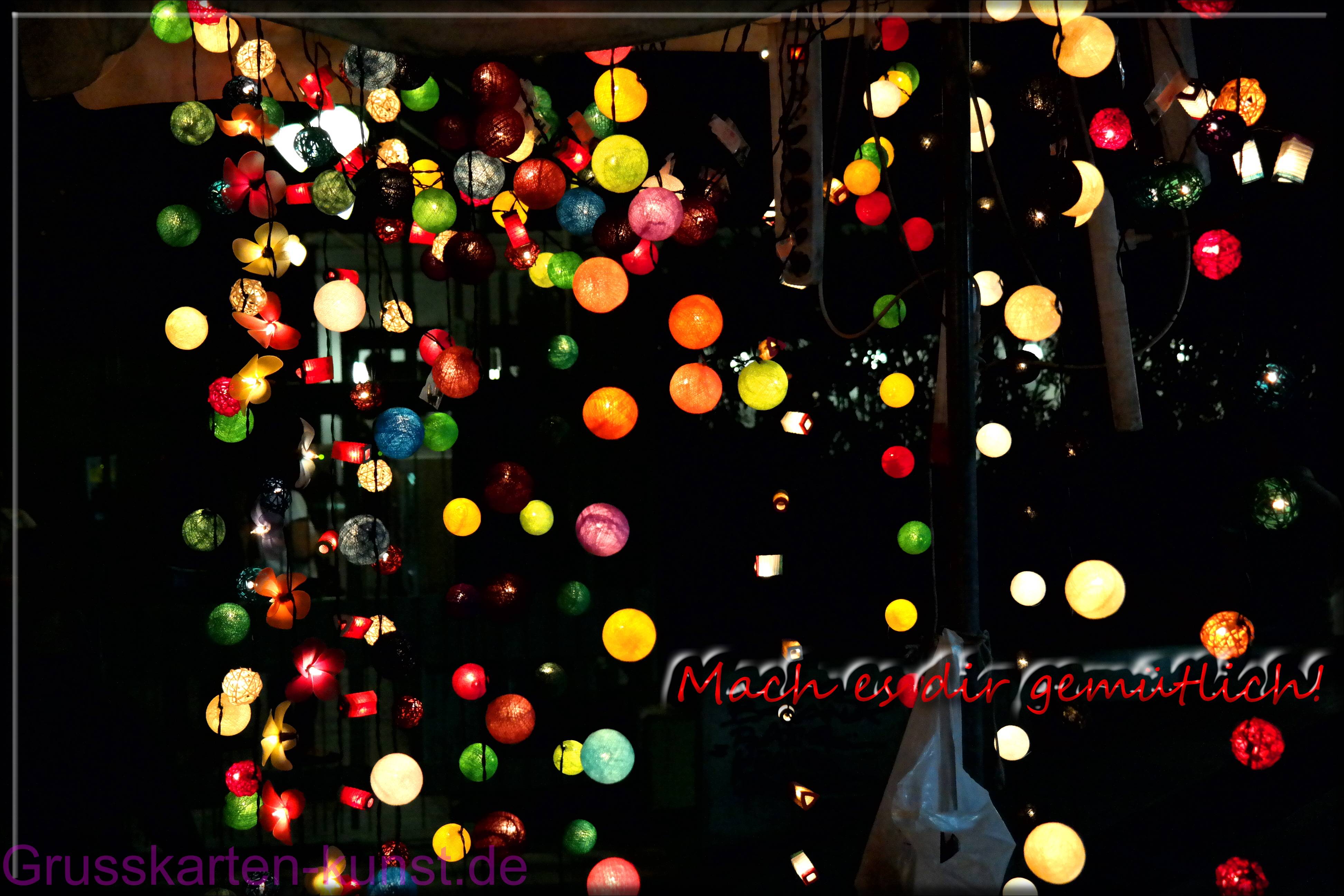 | V39 Auf einem Marktstand wurden viele selbstgebastelte Lichterketten mit bunt beleuchteten Kugeln in verschiedener Größe angeboten. Die aufgehängten und beleuchteten Ketten fotografierte ich in der Dunkelheit so dass auf einem schwarzen Hintergrund kreuz und quer viele bunte, runde Kugeln leuchten. Stimmungsvoller Aufheller für dunkle Tage? Dezenter Schriftzug "Mach es dir gemütlich" Mail mit der Karte V39 versenden Karte V39 vergrößern | |