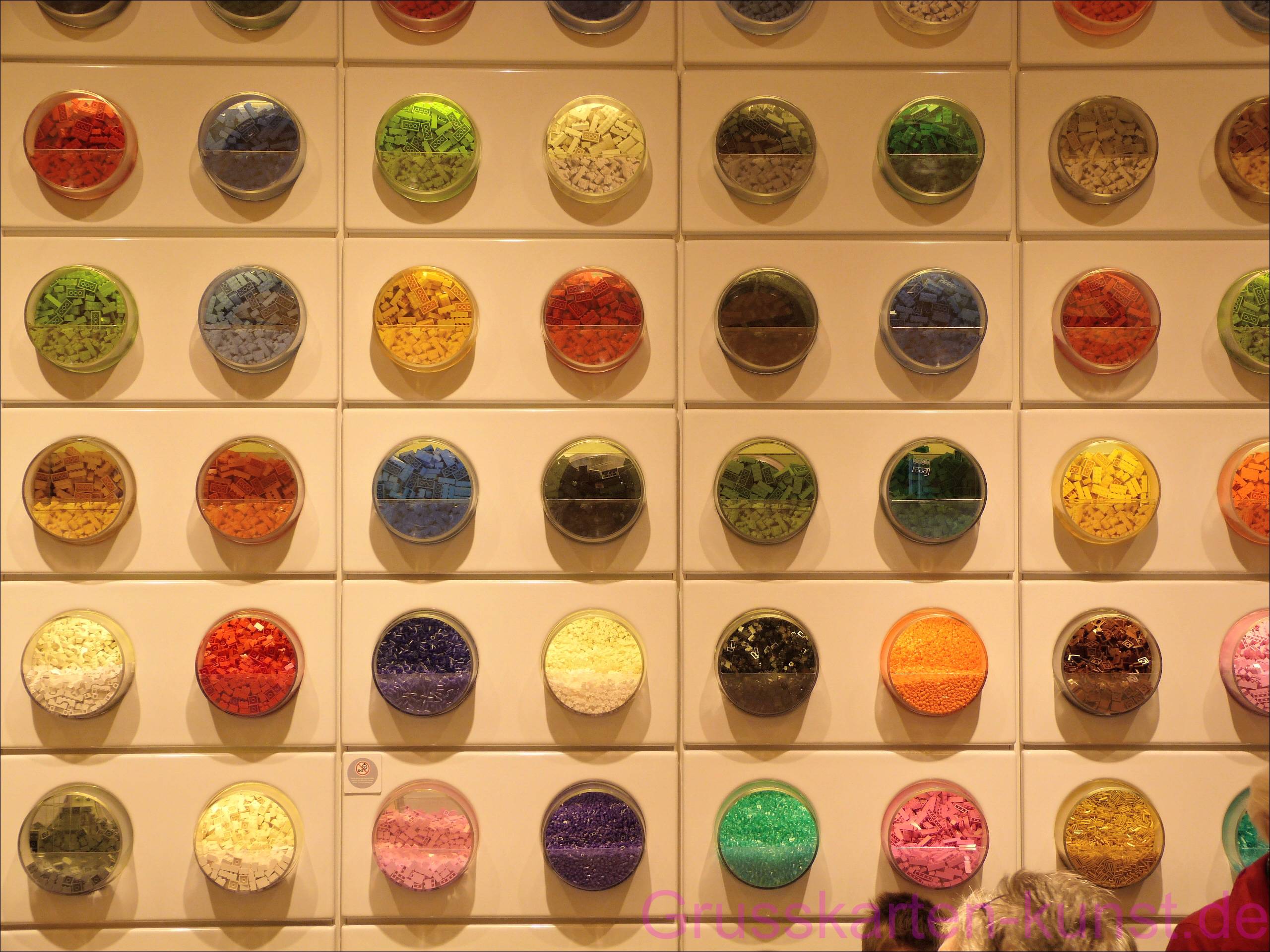 | V40 Sie sehen 5 Reihen a 8 runde Glasboxen, die in eine Wand eingelassen sind. In den Glasboxen befinden sich jeweils gleichfarbige Legosteine. So entsteht eine bunte Wand, die trübe Tage etwas erfrischen kann.Heute gibt es Legosteine in unzähligen Farben. Mail mit der Karte V40 versenden Karte V40 vergrößern | |