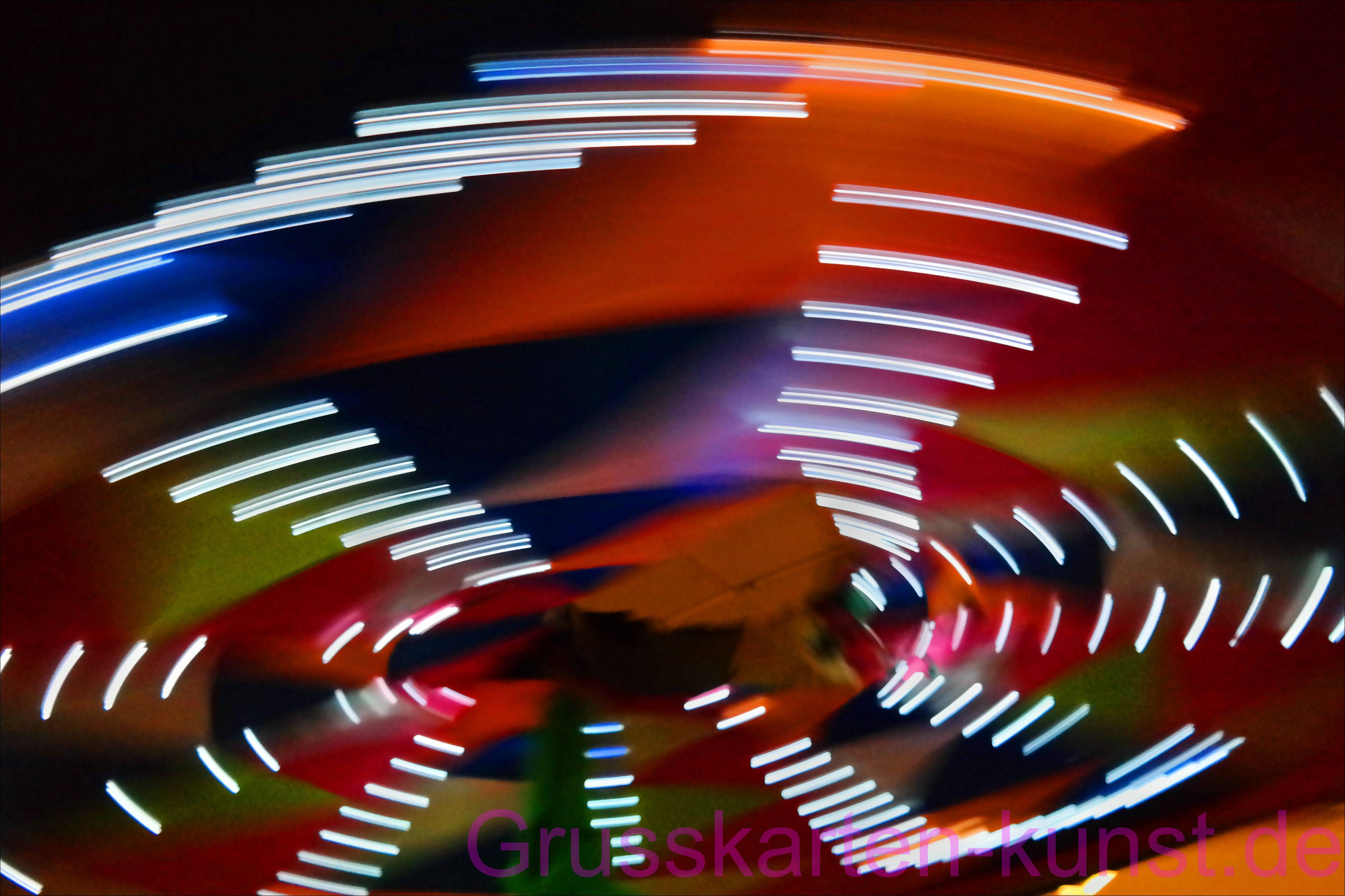 | V42 Wie ein buntes, sich drehendes Karussell erscheint hier farbig leuchtend eine eingefrorene Bewegung durch eine viertelsekündige Belichtung. Dies verursacht exzentrisch nach außen verlaufende Streifen, denn dies ist kein Karussell, sondern ein sich schnell drehender Tellerrock, den ein ägyptischer Tänzer um seine Hüfte trägt und der ein vielfarbiges Patchwork Muster enthält. Allerdings hat der Rock an der Unterseite auch einige Leuchtdioden, die bei Bedarf angestellt werden können. So entsteht in verschiedenen Radien ein streifiger Effekt weißen Lichts, der den farbigen Rock erhellt und somit zum Strahlen bringt. Der Tänzer drehte sich Minutenlang in unglaublichert Geschwindigkeit um seine Achse, sodass der Rock sich auf- und abwärts bewegte und somit verschiedenfarbige Effekte entstanden. Der hier dunkle Hintergrund unterstützt den das ganze Bild ausfüllende, ellyptischen Knalleffekt. Atemberaubend Schauen Sie auch unter Hochzeit/Liebe 38, dort sieht man sich den den Tänzer bewegen. Mail mit der Karte V42 versenden Karte V42 versenden | |