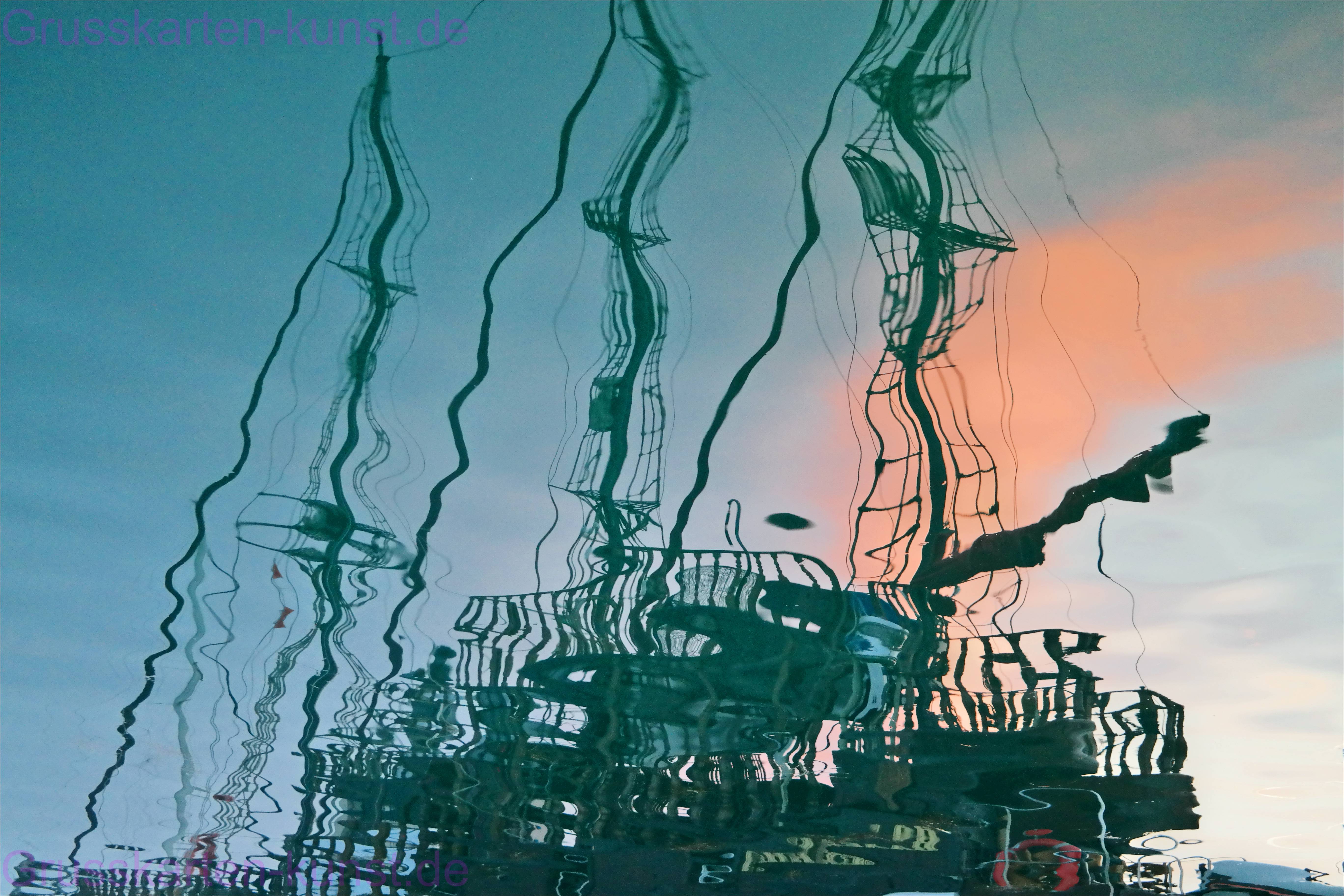 | V44 Stellen Sie sich ein Piratenschiff mit 3 Masten, einem Ausguck 2 übereinander liegenden Decks mit Holzbrüstungen und einer Menge Takelage vor. Eben so, wie bei Pippi Langstrumpf... Dieses Schiff spiegelt sich im ruhigen Hafenwasser von Bar. Normalerweise müsste es auf dem Kopf stehen, ich habe es aber um 180 Grad gedreht, so sieht es richtig herum aus. Die leichten Wellenbewegungen des Wassers lassen die vielen Einzelteile des Schiffes optisch schlingern, so dass ein bizarres Bild entsteht. Der Hintergrund ist eine himmelblaue Spiegelung mit lachsrosa Schleierbewölkung bei einem Sonnenuntergang. Klasse. Mail mit der Karte V44 versenden Karte V44 vergrößern | |