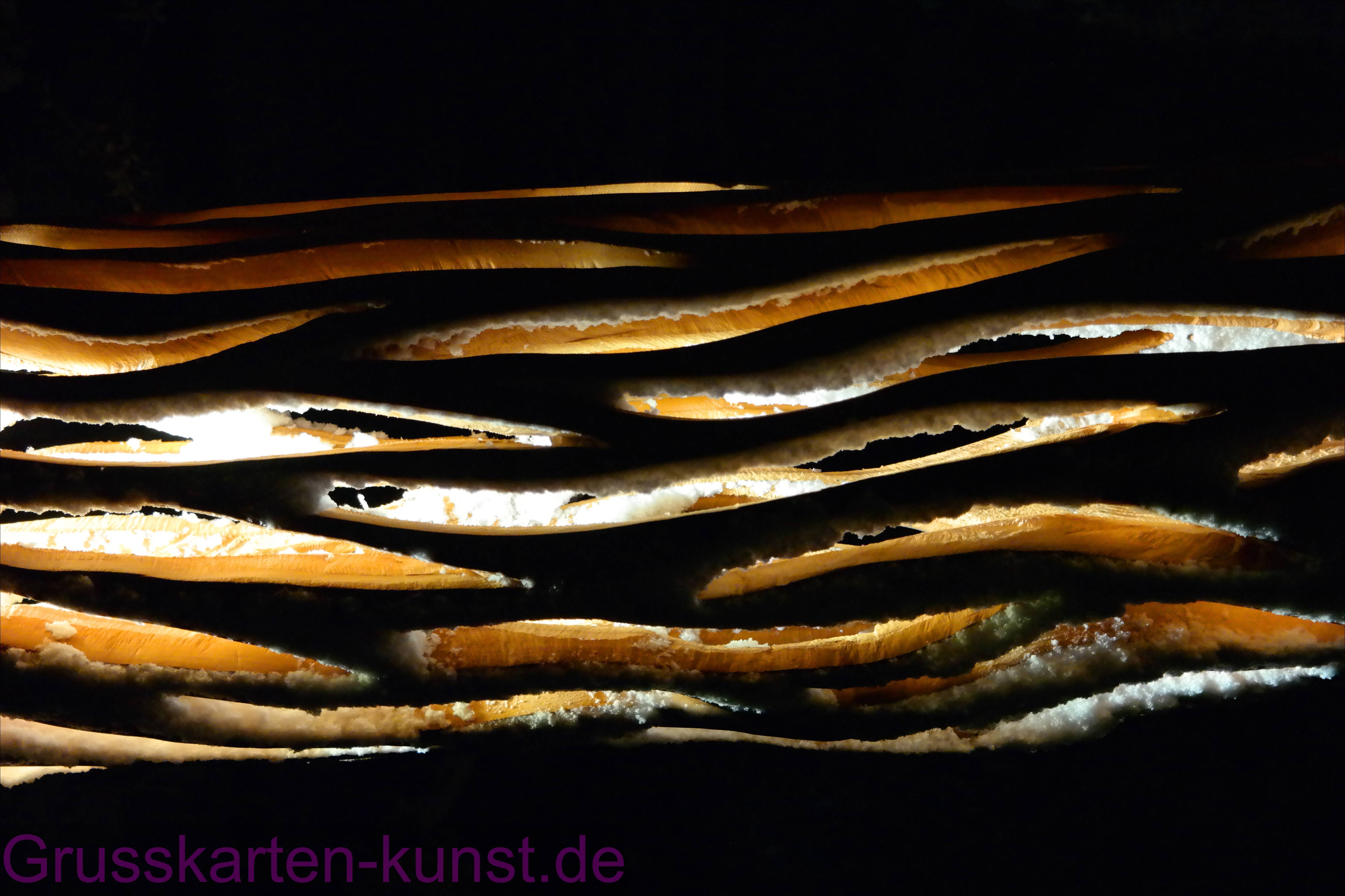 | V45 Ein guter Freund hat für uns einen Baumstamm von 2,50m Höhe und 70 cm Durchmesser ausgehöhlt und mit der Motorsäge schlangenförmige Stücke von außen nach innen in den Stamm geschnitten. Diese schmiegen sich aneinander an und ergeben ringsrum ein Geflecht, das, wenn es von innen beleuchtet wird, wie ein lebhaftes Feuer "flackert". Diese Flammenlampe ist ein unikat. Hier liegt sie vor einem nachtschwarzen Hintergrund quer im Bild, eine dünne Schneepulverschicht bedeckt einige Wellen. Es entsteht ein phantastisches Bild, das den Betrachter in den Bann zieht - was ist das denn? Hammer ! Danke, Sigi Mail mit der Karte V45 versenden Karte V45 vergrößern | |
