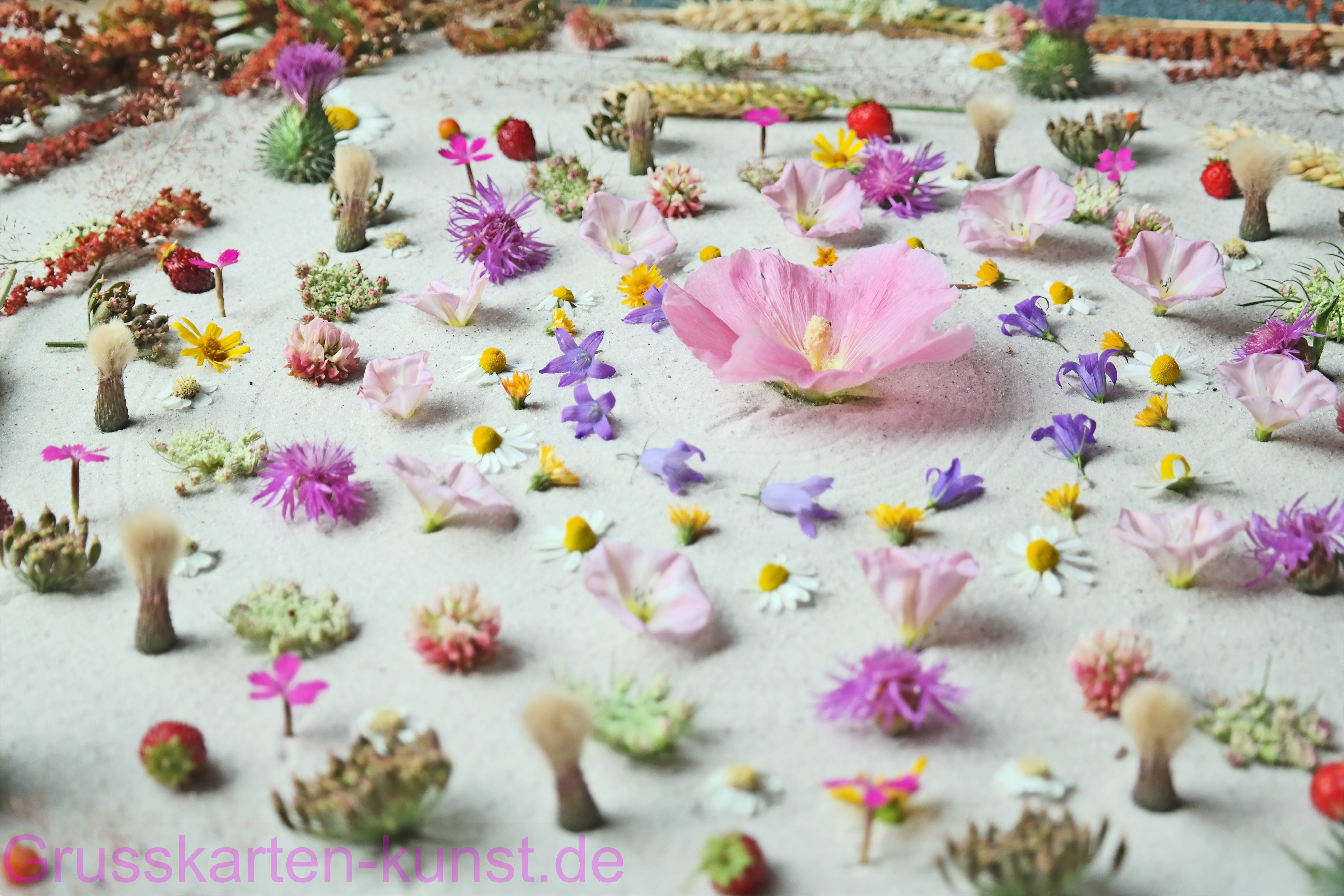 | V46 Ein Blumenarrangement im feinen Quarzsand gesteckt. Feinste Wildwiesenblumen drapieren sich stehend oder liegend um eine rosa-weiße Malvenblüte. Gelbe, Lila, Weiße, Pinke und rostorangene Blüten oder Blütenreste (flauschige "Pinsel" von verblühten Disteln) machen diese Karte zu einem Hingucker. Mit der Tiefenschärfe der Kamera bekommt alles einen geheimnissvoll freundlich-frischen Charakter. Unsere ART zu entspannen. Siehe auch N13 Mail mit der Karte V46 versenden Karte V46 vergrößern | |