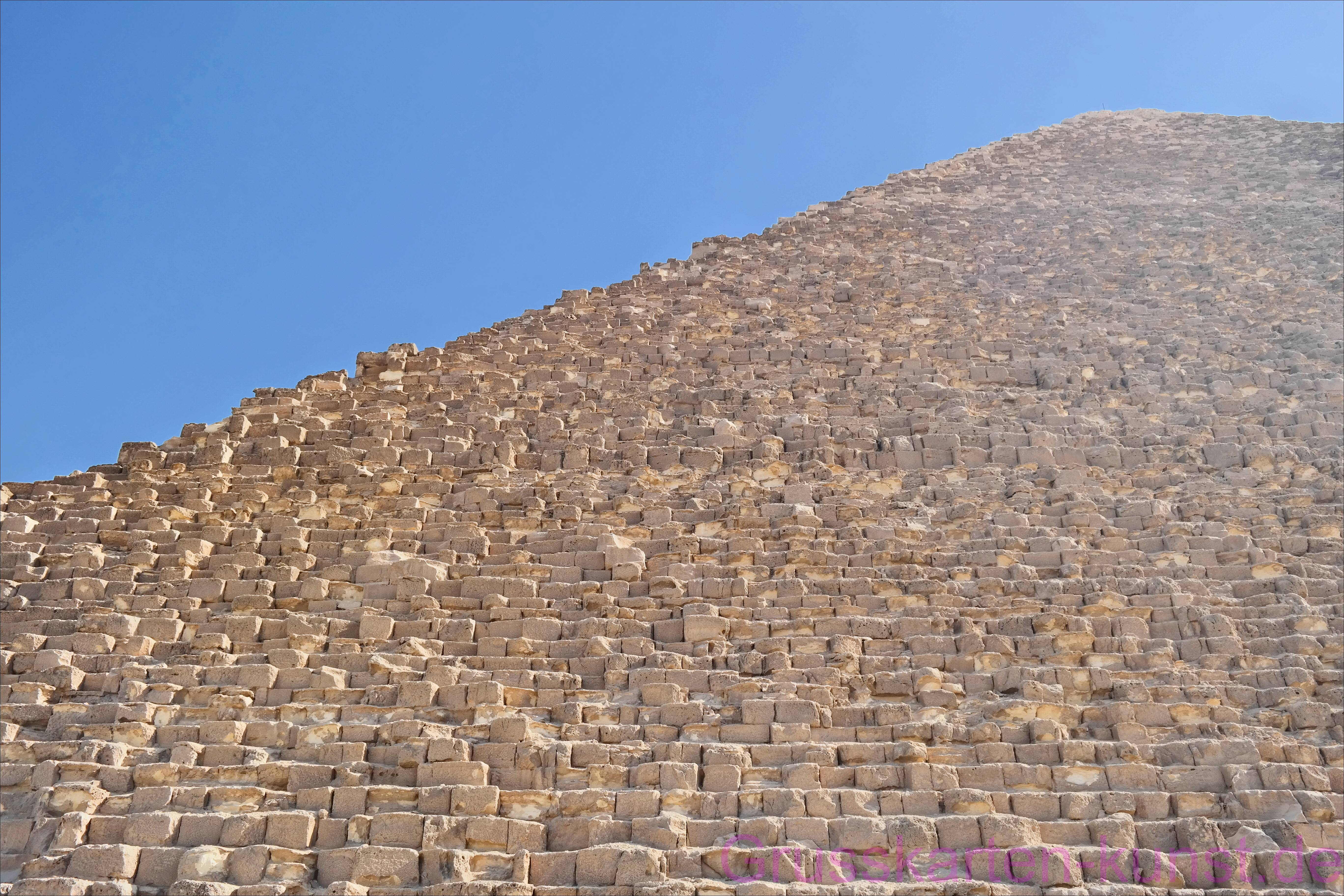 | V47 Hier wurde fast senkrecht empor die Cheops Pyramide in den knallblauen Himmel fotografiert. Könnte auch eine optische Täuschung sein. Stein an Stein und Stufe um Stufe kann man hier hautnah eine Vorstellung von der Dimension dieses Weltwunders erahnen. Einer der 4 Schenkel zieht sich vom unteren linken Bildrand bis hin fast zur oberen rechten Ecke. Sie sehen Zweidrittel Stein und Eindrittel Himmel. Schicken Sie es als Rätsel... Hochklettern will da jeder. Mail mit der Karte V47 versenden Karte V47 vergrößern | |