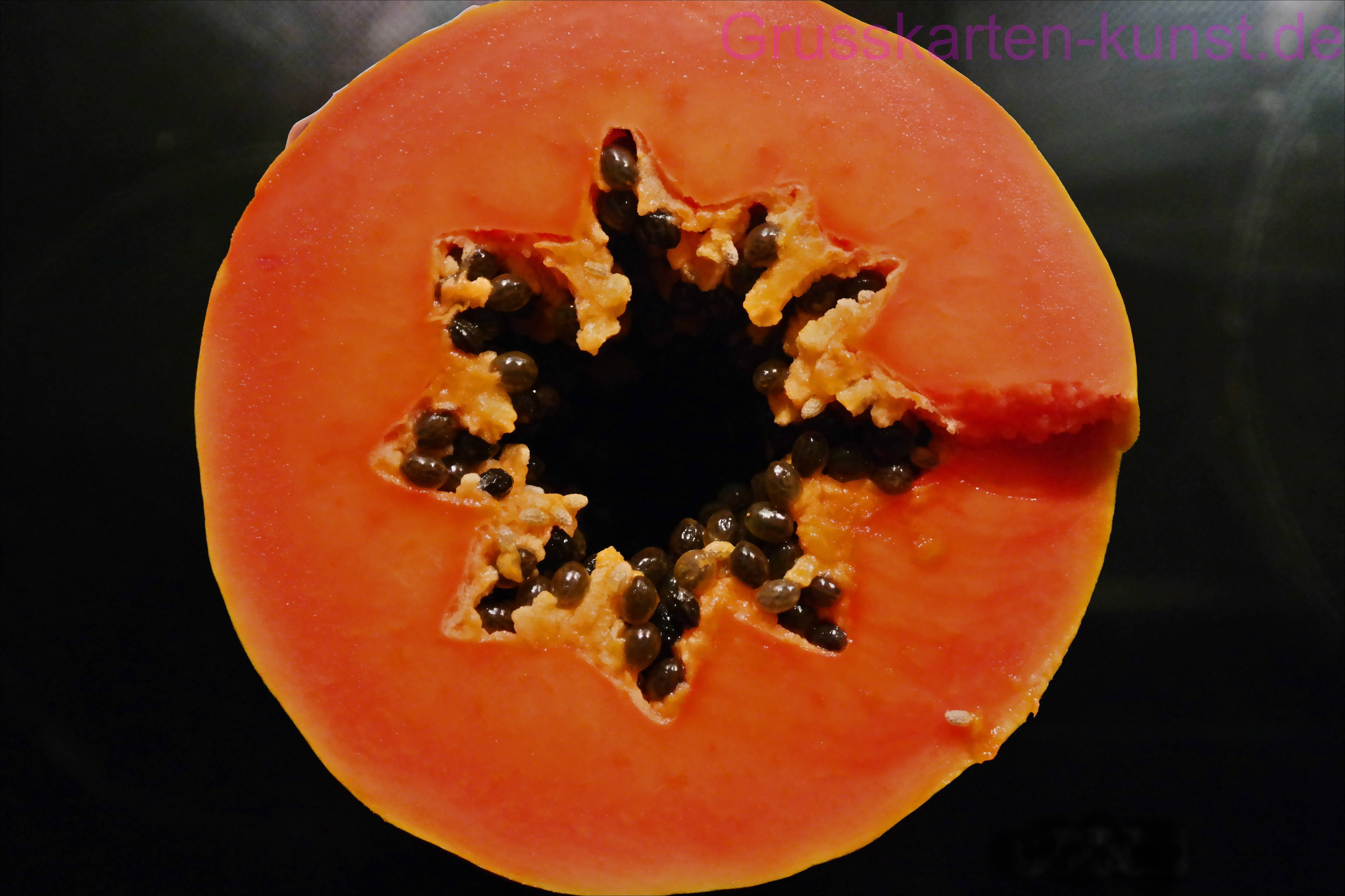 | V48 Eine quer aufgeschnittene Papaya bietet einen tollen Einblick. Der Querschnitt zeigt die Kreisrunde Scheibe einer orangefruchtigen Papaya. Das Interessante: Bei dieser Frucht ist der innere, hohle Teil, der die schwarzperligen Samen enthält, gleichmäßig sternförmig. So ergeben sich sozusagen 9 Zacken in deren inneren die Samen liegen. Das knallorangene Fruchtfleisch liegt kreisförmig darum. Zur Schale hin ist ein feiner, hellerer Streifen zu sehen. Das Ganze liegt vor einem schwarzglänzendem Hintergrund. Sozusagen die Wierdespiegelung des inneren Sterns. Fruchtig, frisch zu verschicken mit einem ebensolchen Ermutigungs- Spruch ? Mail mit der Karte V48 versenden Karte V48 vergrößern | |